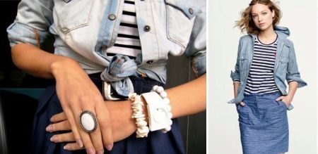 Denim stuff goes great with each other. For jeans and denim skirts, the perfect pair will be denim jackets and shirts. However, one important rule must be observed: in a denim set, the upper part must be at least a couple of shades lighter or darker than the bottom.
