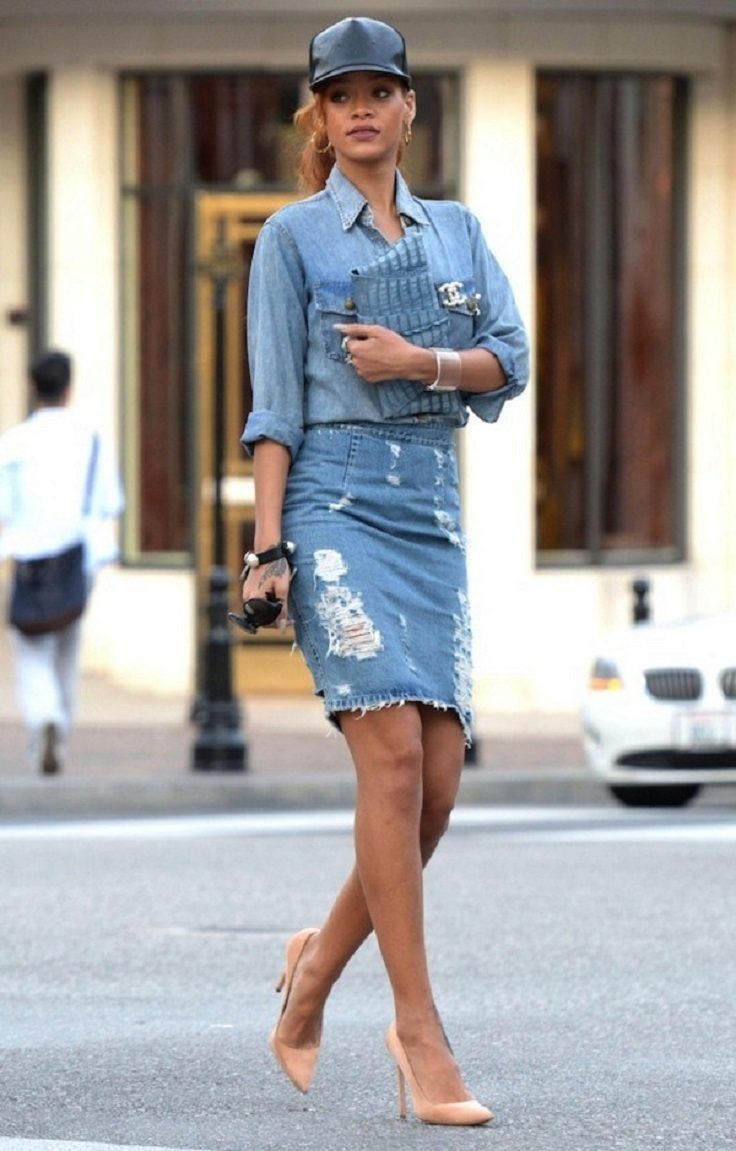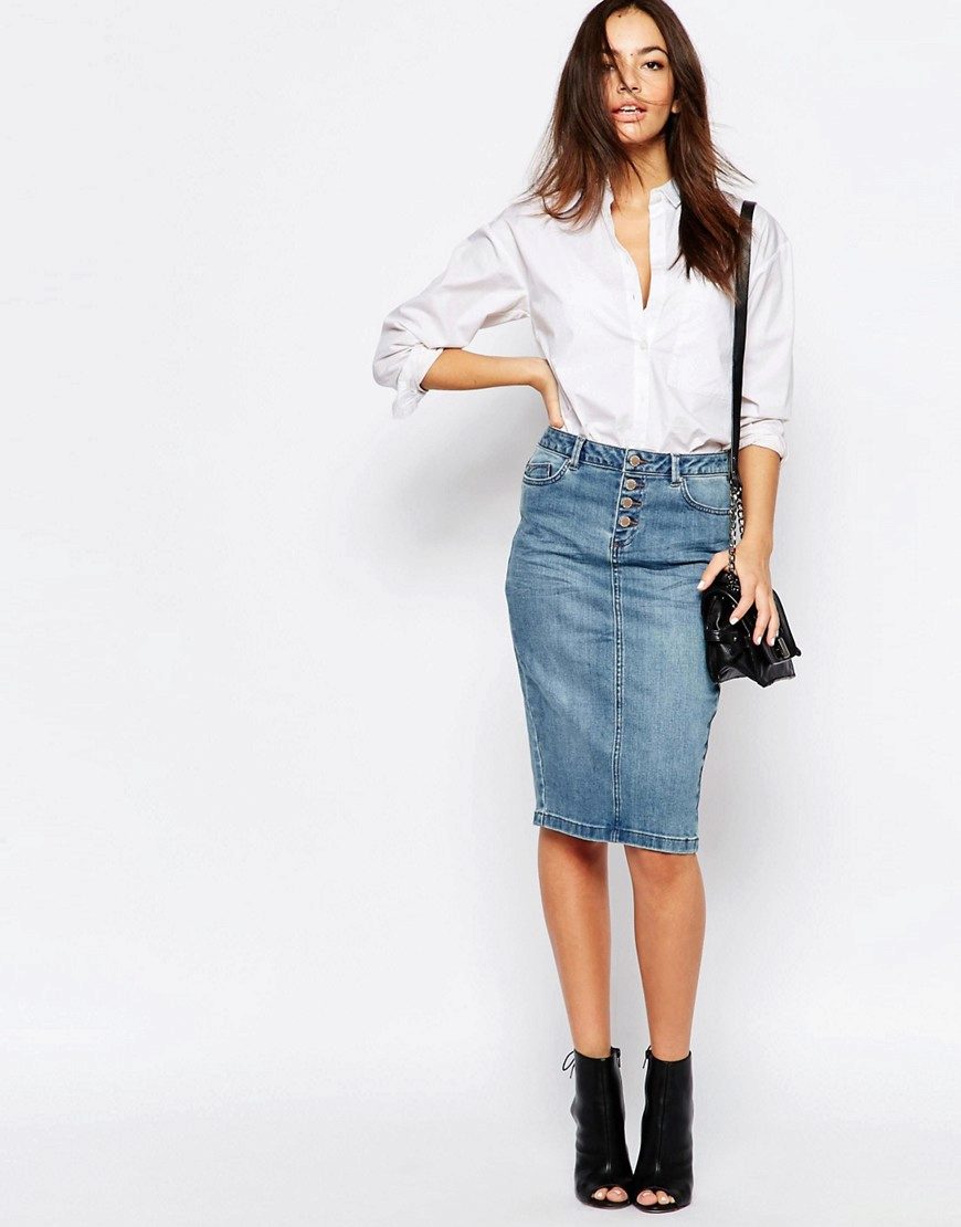 Putting on a pencil skirt in a denim skirt to the office, it is combined with a strict shirt and high-heeled pumps. The image can be supplemented with a leather belt, a stylish leather bag and sunglasses.