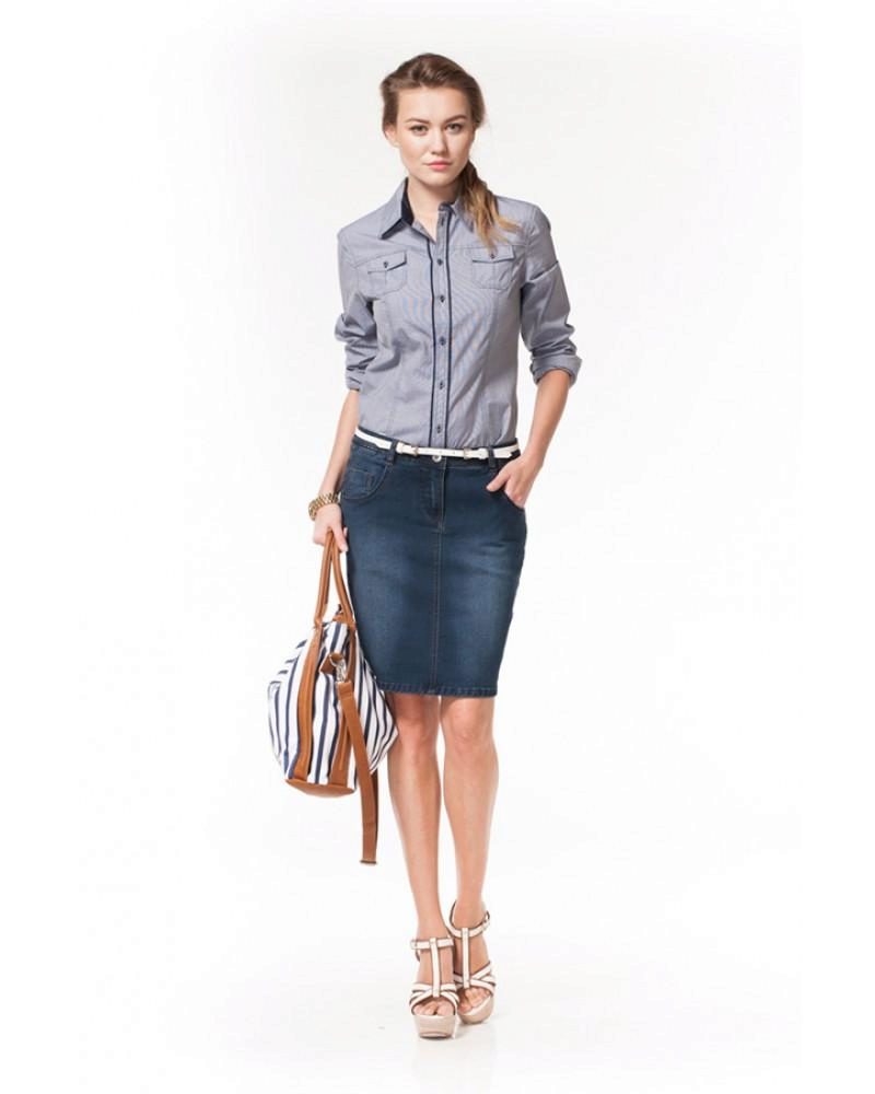 The most common length of skirts denim pencil is medium - to the knees, as well as slightly higher or slightly lower. In this skirt, you can go to the office or go out with friends. Usually it is complemented with blouses or shirts, and accessories, shoes or sandals are selected depending on the image being created.