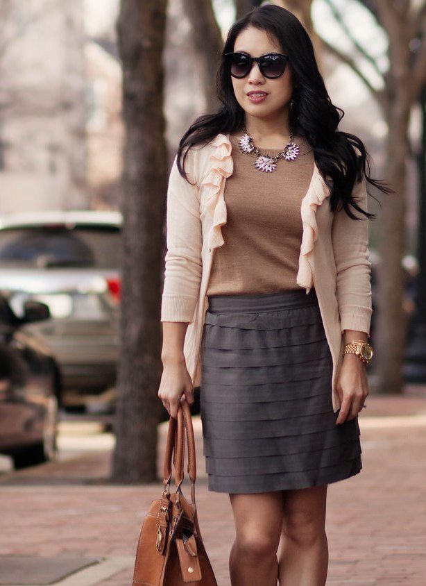Among the variety of models is to stay on the skirt-year, which creates a wonderful tandem with an elegant blouse, complemented by an interesting finish. A gentle shawl, a beautiful brooch or small ruffles will help create an unforgettable image.