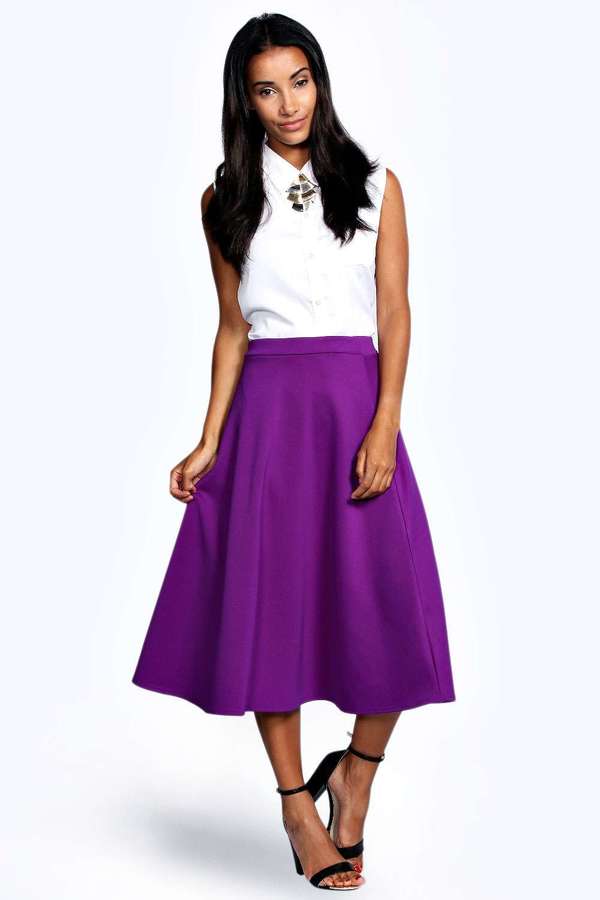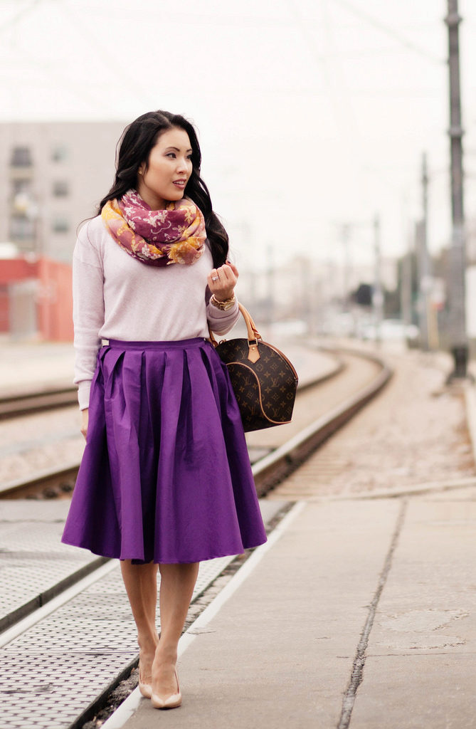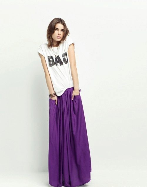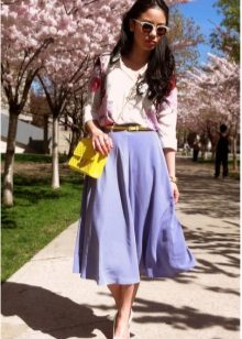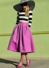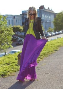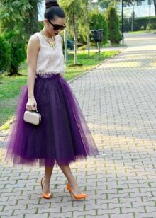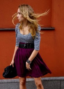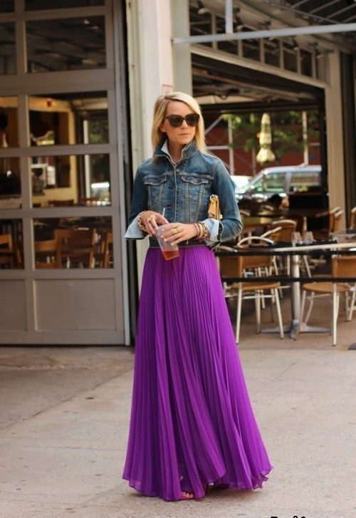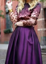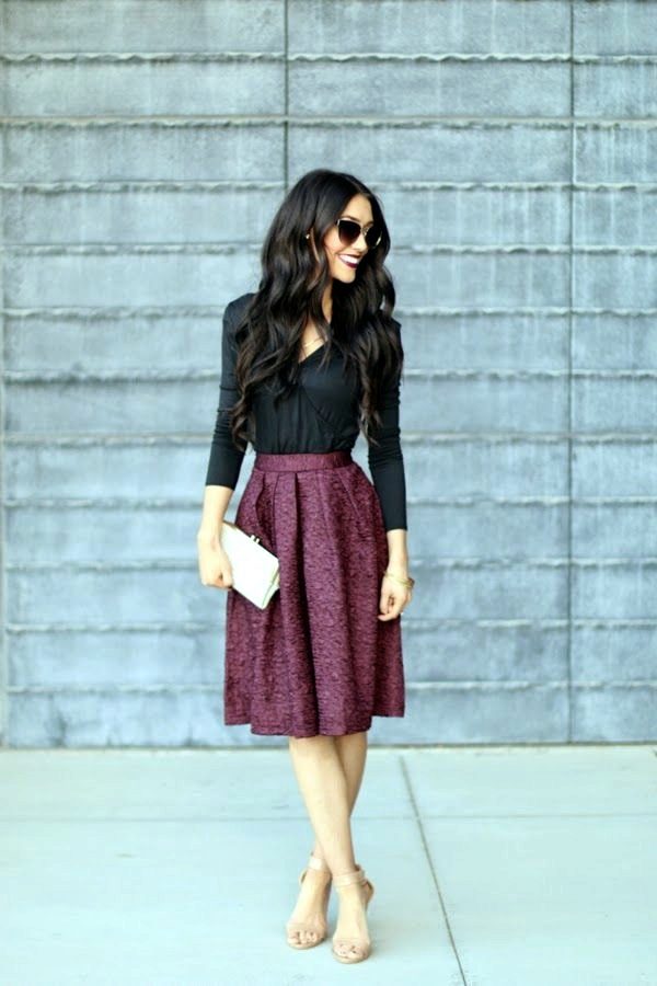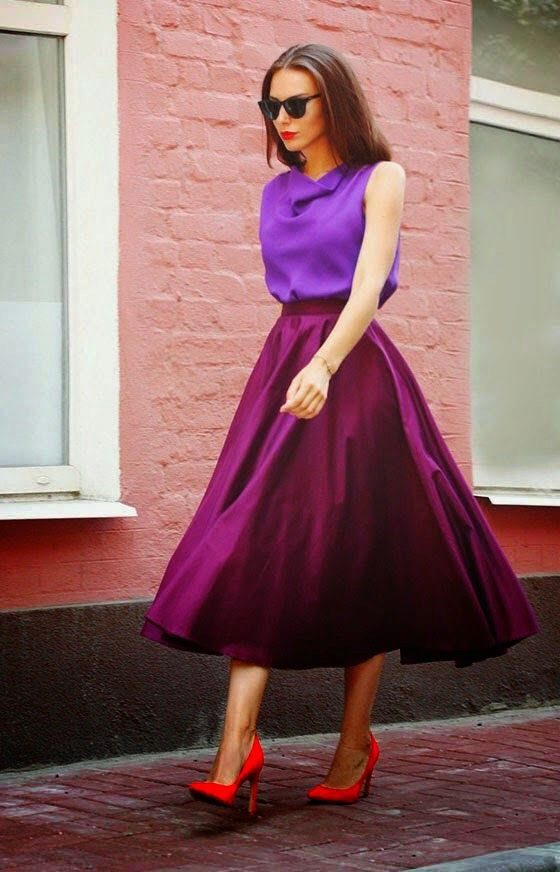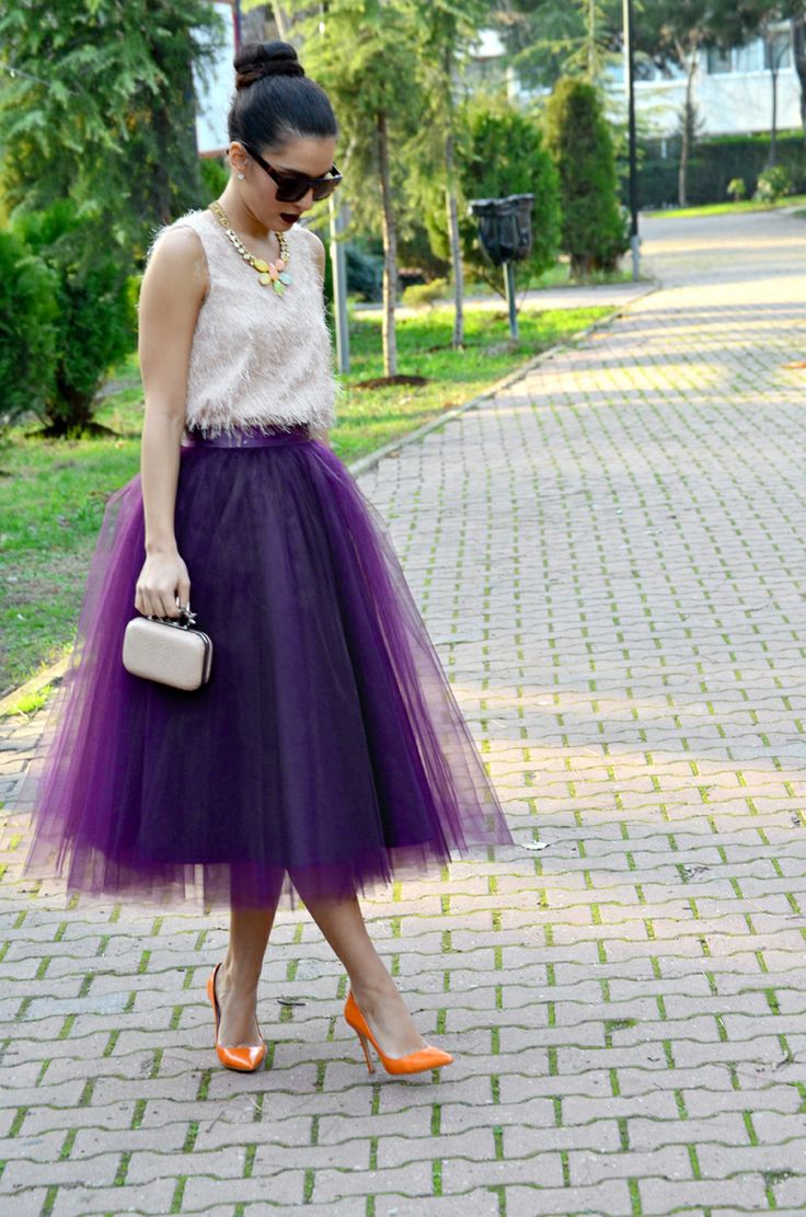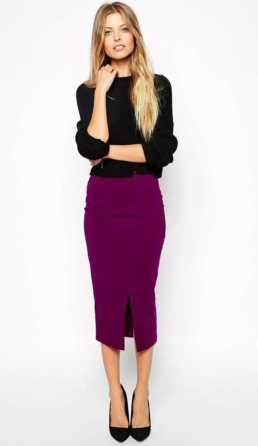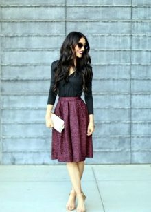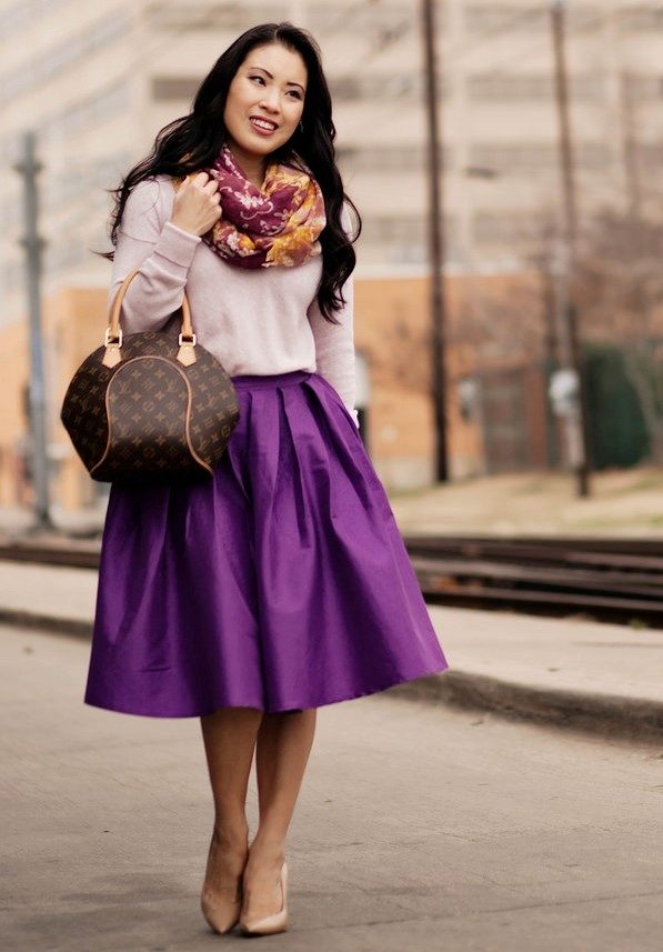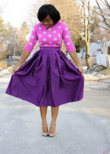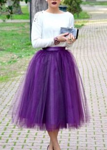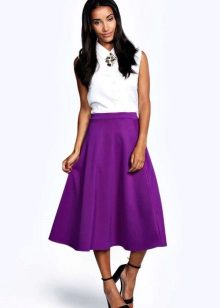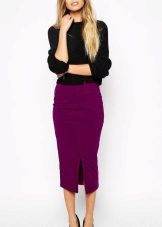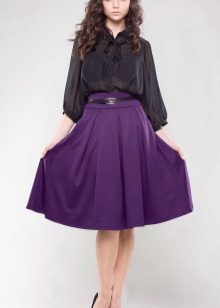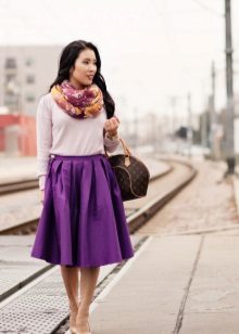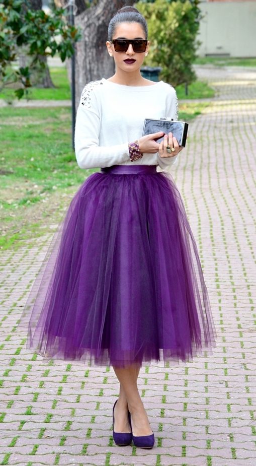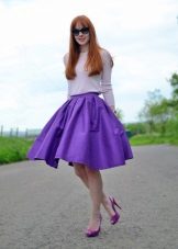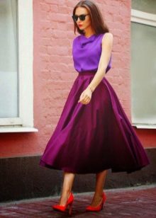 Depending on the style and length, the purple skirt can be worn almost anywhere. A short flared one will look very impressive at a party. A strict knee-length pencil skirt is a very winning option for a business lady. The tulip skirt in the length of the midi is perfect for a date, and the maxi model of straight cut will favorably distinguish you at the celebration.