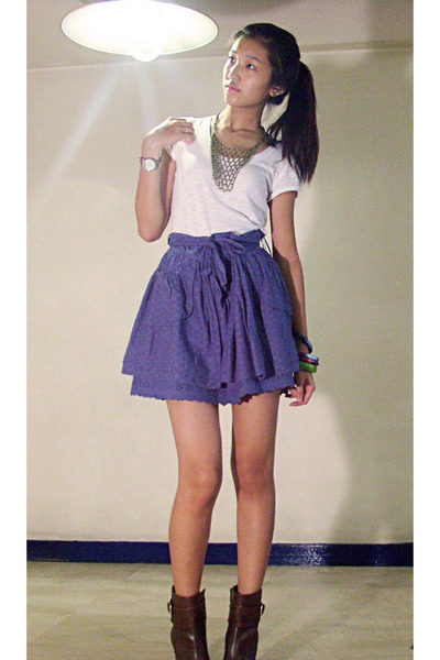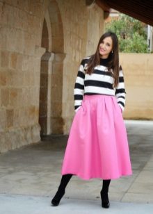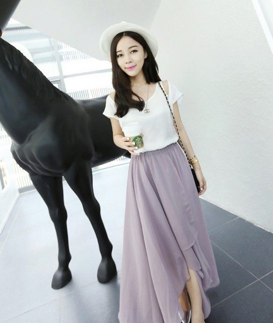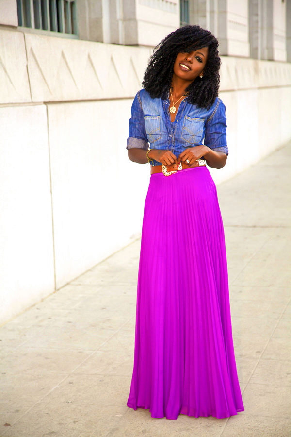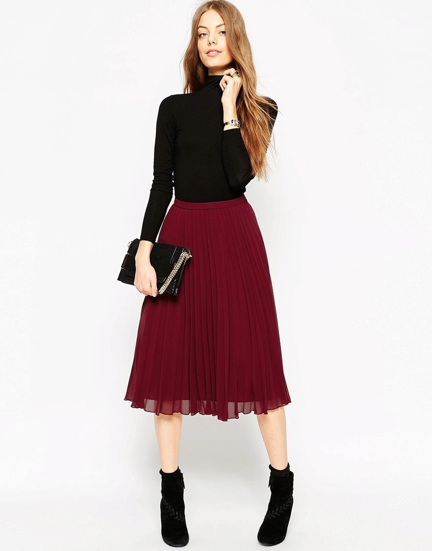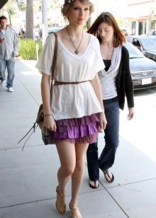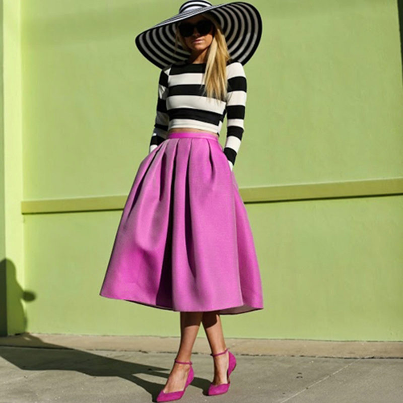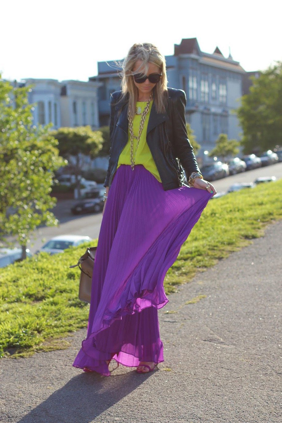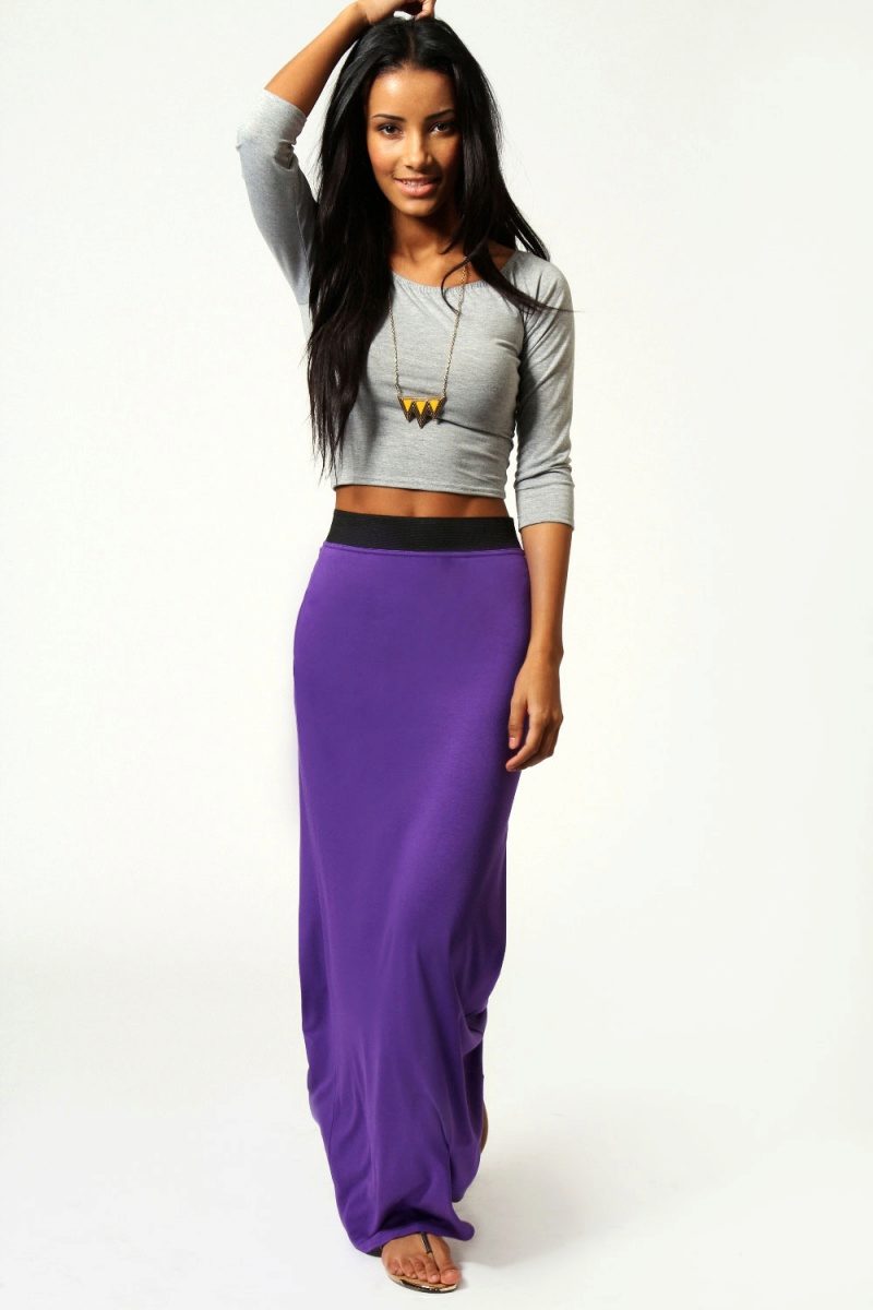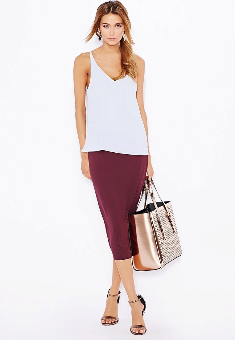 Depending on the style and length, the purple skirt can be worn almost anywhere. A short flared one will look very impressive at a party. A strict knee-length pencil skirt is a very winning option for a business lady. The tulip skirt in the length of the midi is perfect for a date, and the maxi model of straight cut will favorably distinguish you at the celebration.