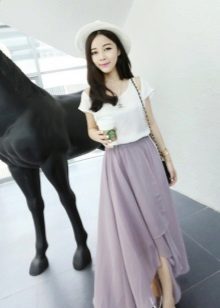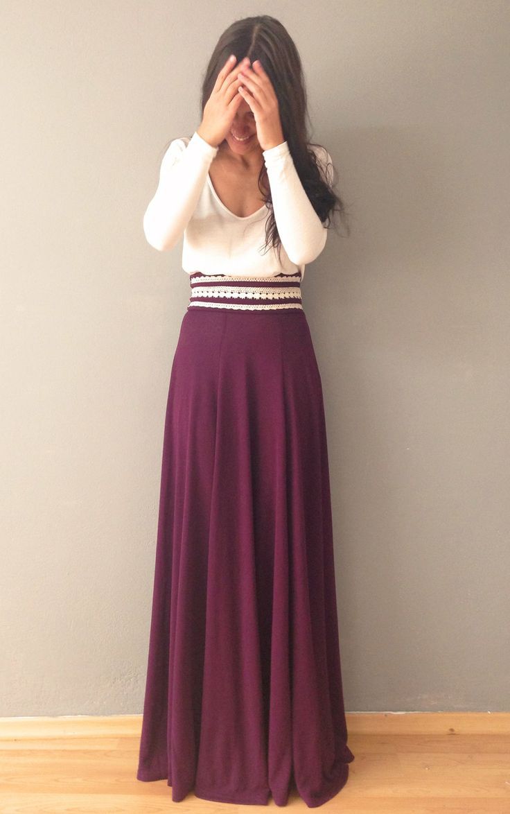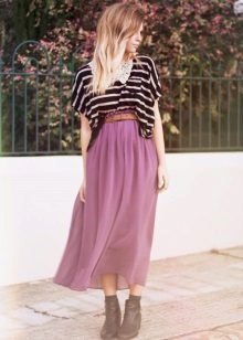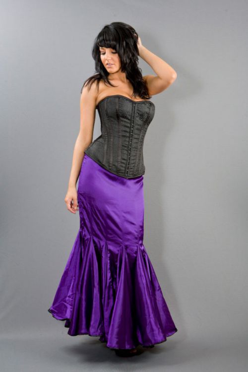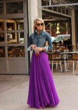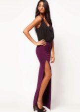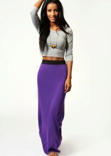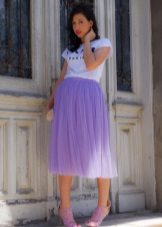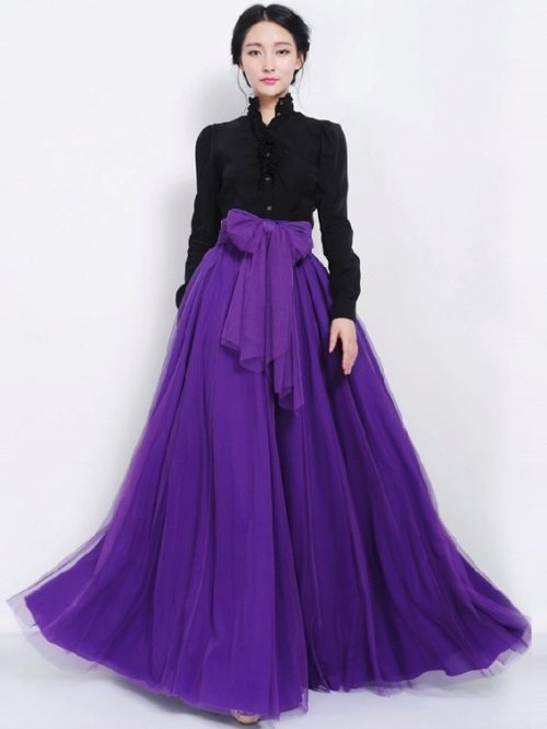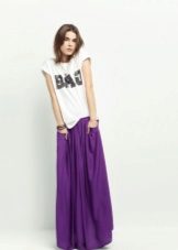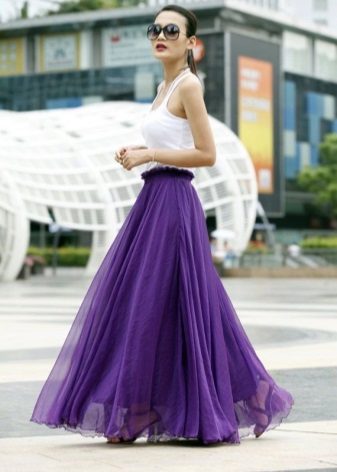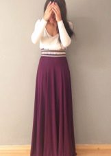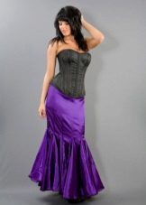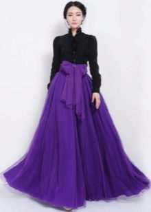 A wearable fabric (for example, velvet), a purple long skirt will be an excellent option for a gala evening. The accent of the image can be made a small train. You can combine it with a black blouse with sleeves-flashlights. Modest classic shoes are appropriate for your feet. Completion of the appearance will be a diadem.