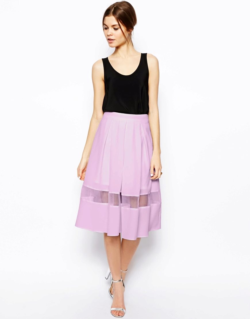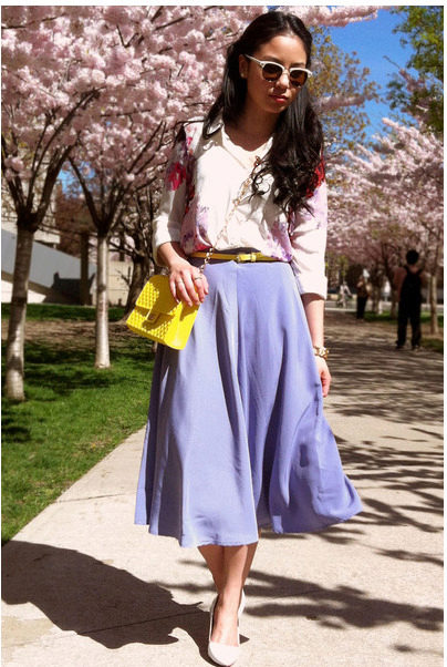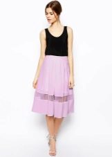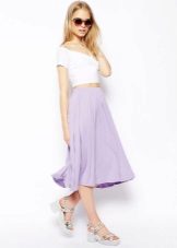 It looks interesting purple in combination with all shades of green. The combination of a lavender-colored skirt with a pistachio top will be an excellent clothing option for meeting friends or shopping.