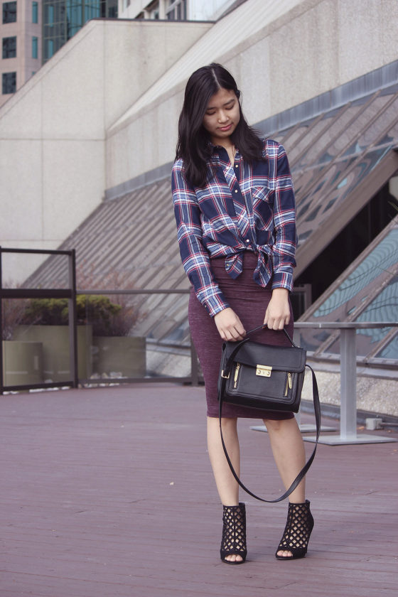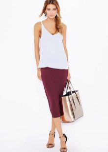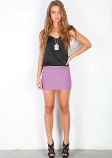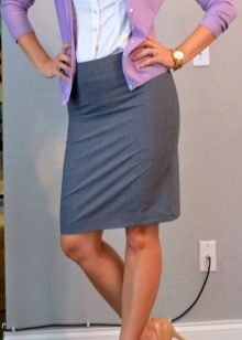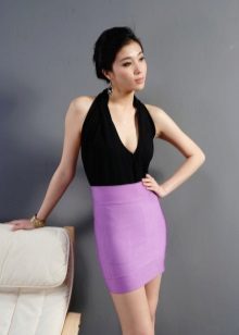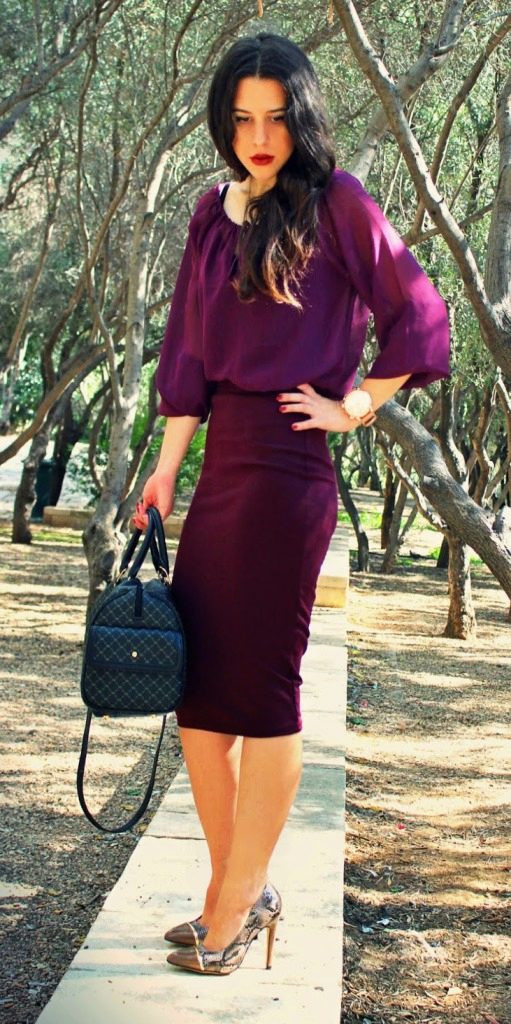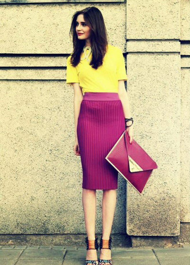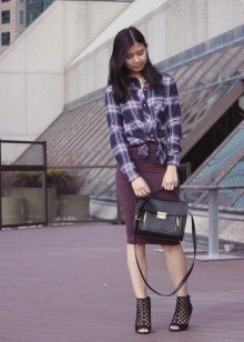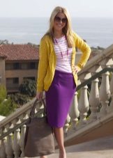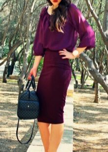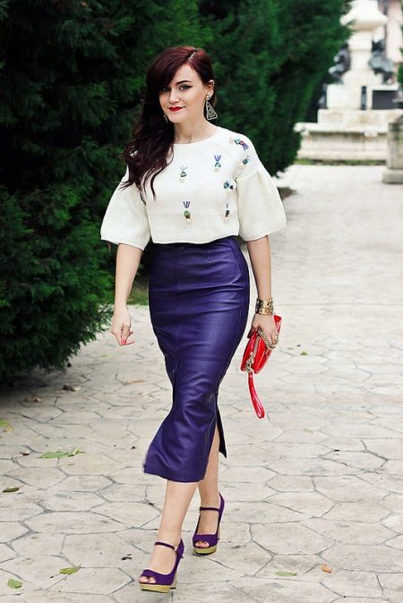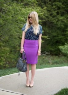 A purple pencil skirt is a thing that imposes strictness in the whole image. Most often, this model is an attribute of business style clothing, and, accordingly, involves a strict blouse and heels. You can diversify this bold business bow with an interesting print on the skirt, for example, with a black geometric ornament.