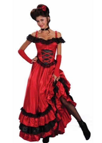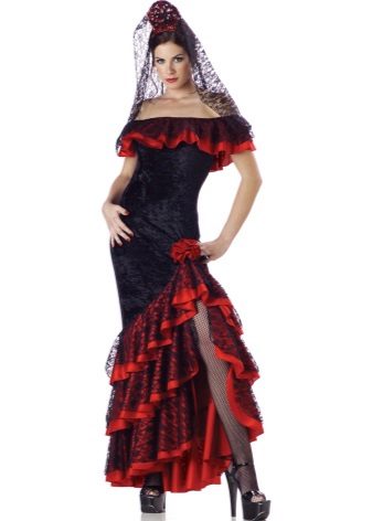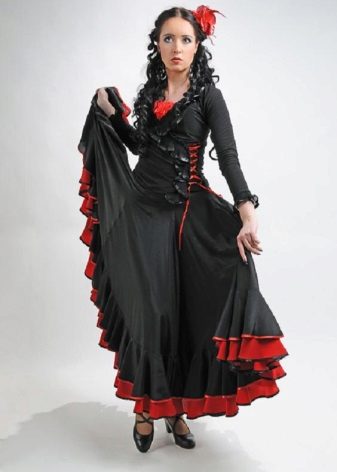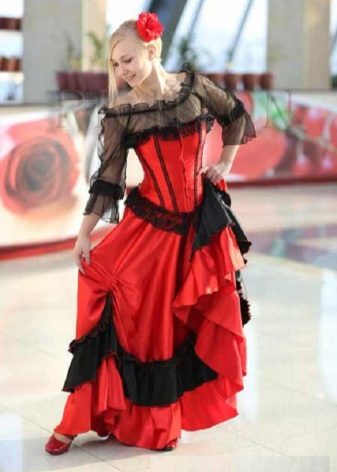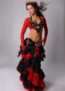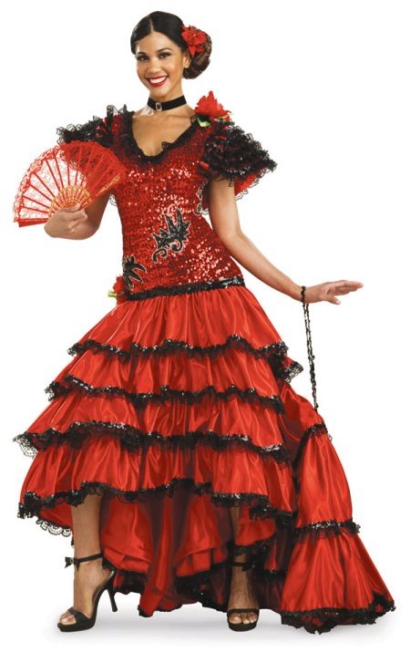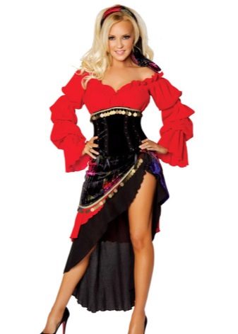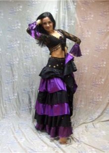 Gypsy costume is also called a dress, in which, in addition to the skirt described above, there is a completely fitting top with a deep oval neckline and fitting sleeves, the cuffs of which are also decorated with several layers of flounces.