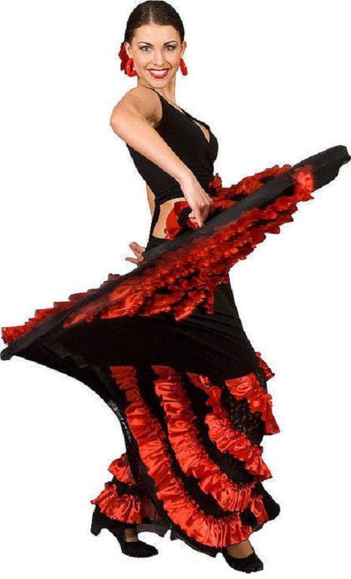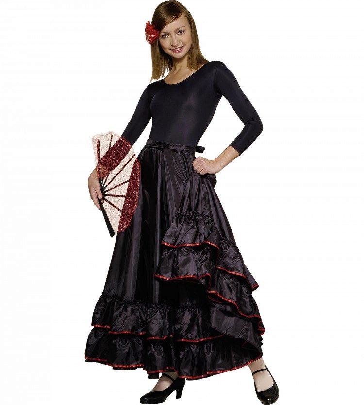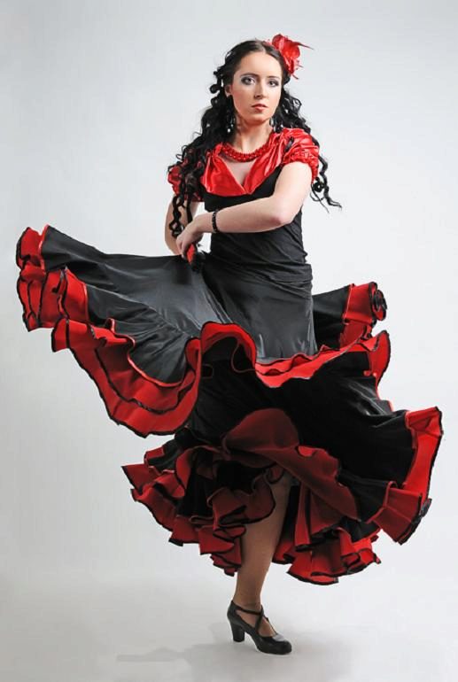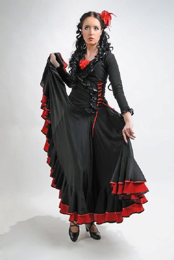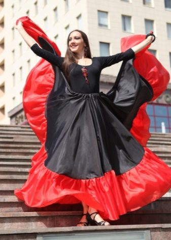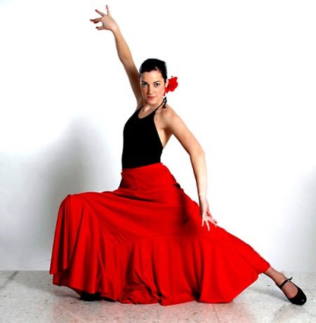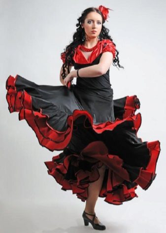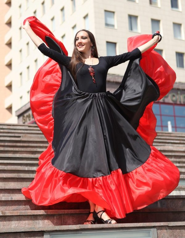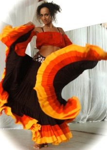 There are two main types of flamenco outfits — special dresses or skirts. The latter can also be classified into two styles. The first option is the so-called gypsy costume. This is a multi-layered skirt that fits the hips and extends just above the knee.