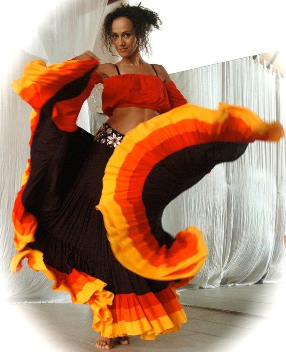 Fitted on top, flared from below, embroidered with a variety of air flounces. The Spanish flamenco skirt looks exactly like this not by chance. Fit on top - for beauty, to emphasize the elegance of the forms of the dancer.