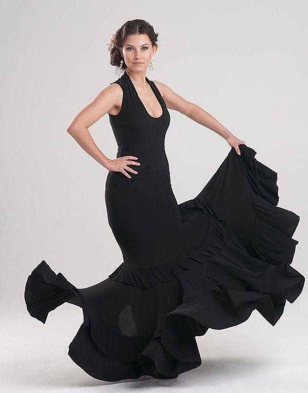 Extends to the bottom - for convenience, so as not to hinder movement. Flounces and frills are the final chord of each stroke. They serve as additional expressive means for flamenco performers.