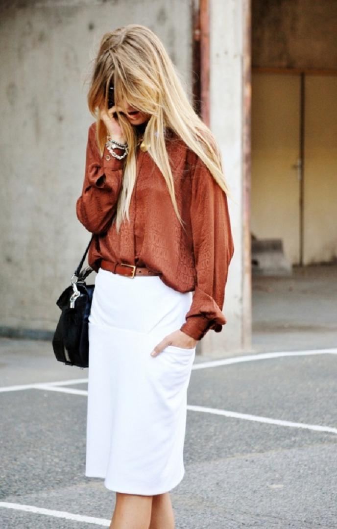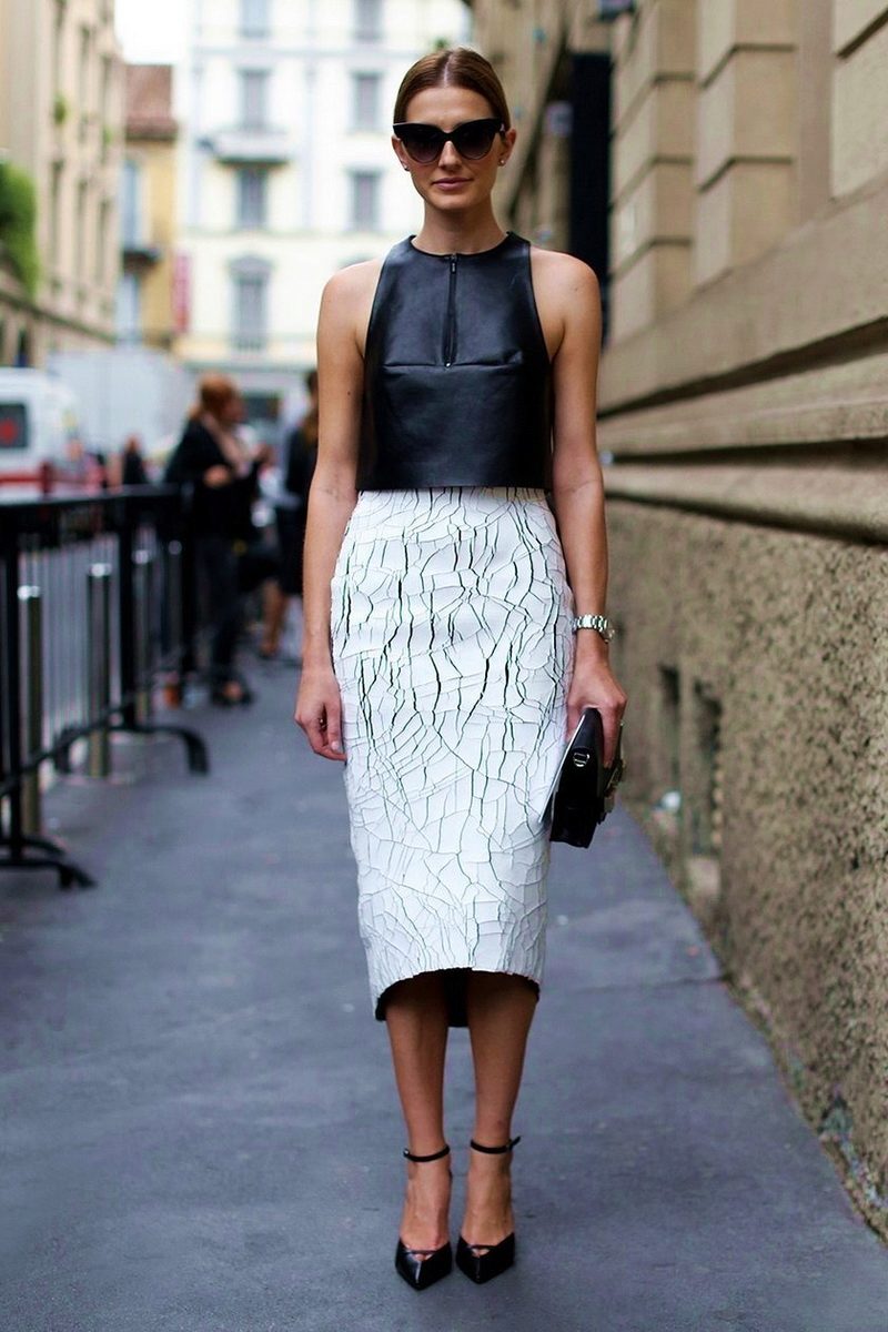 A white pencil skirt looks beautiful with a black top, but it is worth being careful when choosing a blouse model. Everyone knows that the white color is full, therefore, visually the hips will look fuller. Black, on the contrary, reduces the volume.