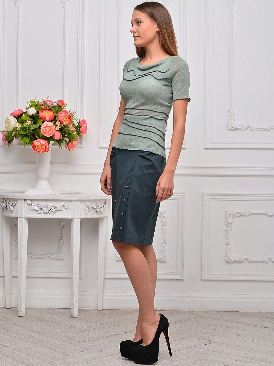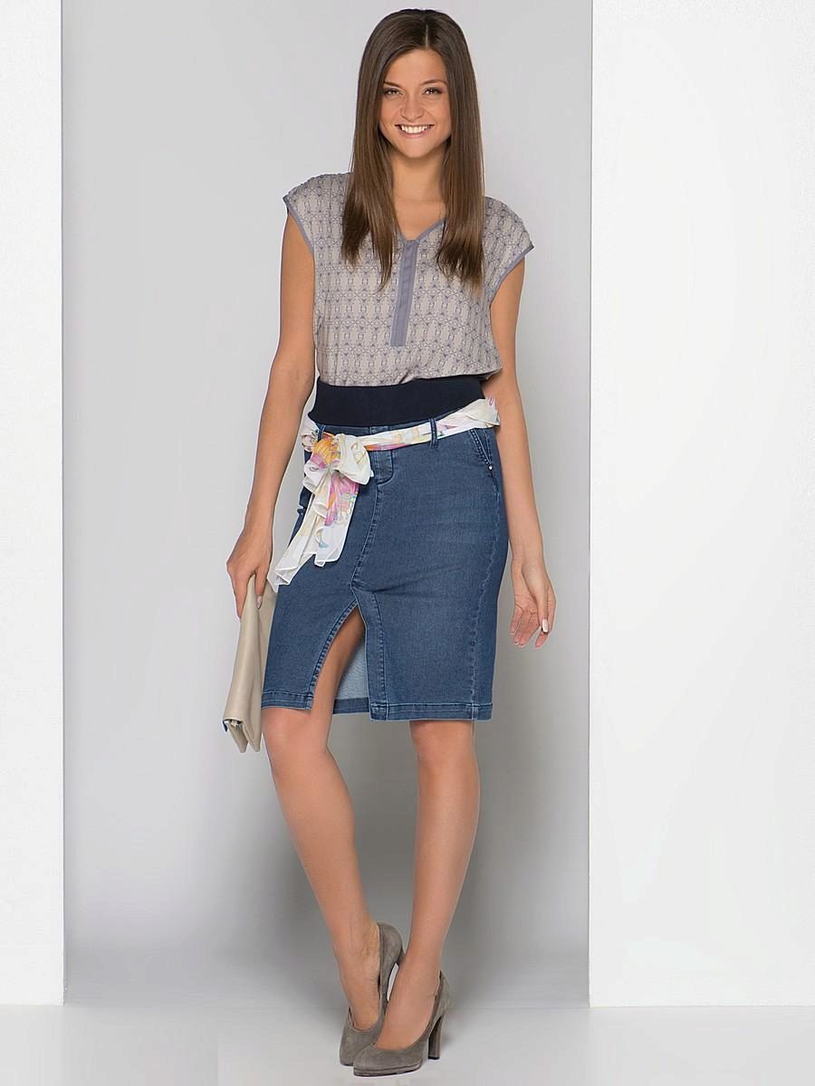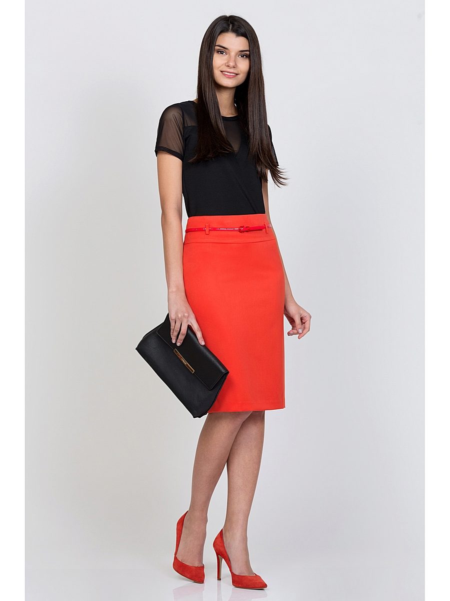 Let's start from the top. To create a business image we use shirts, jackets or turtlenecks. You can get closer to everyday life by combining a skirt with things from casual wardrobe - a sweater or pullover, a sweatshirt with a trendy print, denim or leather jacket. The combination of a pencil skirt with a top decorated with basque looks very elegant.