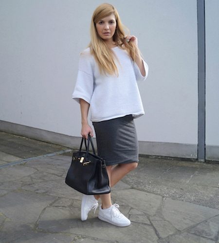 When choosing shoes it is worth to stay on the shoes, preference should be given to models with high heels. Also for casual style, and most importantly for convenience, perfectly fit sneakers, sleepers or sneakers. The color of the shoes depends entirely on personal preferences, because any colors look beautiful with a gray skirt.