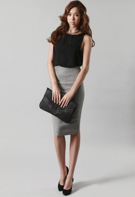 A gray pencil skirt with a high waist is an ideal option for girls with a small tummy. She perfectly hides the extra centimeters at the waist, and also focuses attention on the thin waistline.