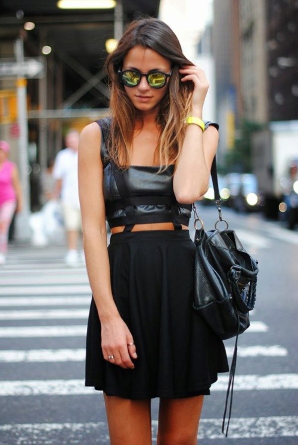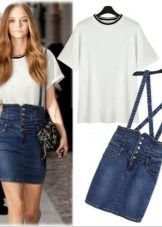 The top of the jumpsuit with a skirt is selected depending on the style and fabric of the product. The semi-overalls skirt is worn with T-shirts, shirts, turtlenecks and blouses. For a denim skirt-jumpsuit, you can pick a crop top, shirt, sweatshirt or bustier. Strict office models are combined with shirts and blouses. In the cool season, a skirt-jumpsuit is combined with a leather jacket or coat.