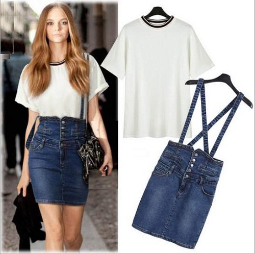As for color combinations, the white top will be the most common and attractive option. No less popular options for the top with prints, such as stripes or flower. Denim models are well combined with a blue or black top.