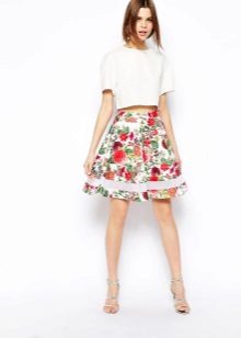 The color scale of such models, as a rule, does not imply multi-colored fabrics, monochromatic mini with high waist looks much more effective. Pastel colors will add tenderness and warmth, and a bright floral top, for example, can be a bright accent in the whole look. High-heeled shoes will be the final touch to a seductive look. Skirts with a high fit are recommended to be worn for low girls, since due to the displacement of the waist line up, the figure is visually stretched.