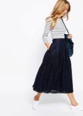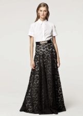 A long lace skirt is most often used to create an evening look. In this case, it should be supplemented with a blouse made of fine satin, batiste, silk or translucent material.