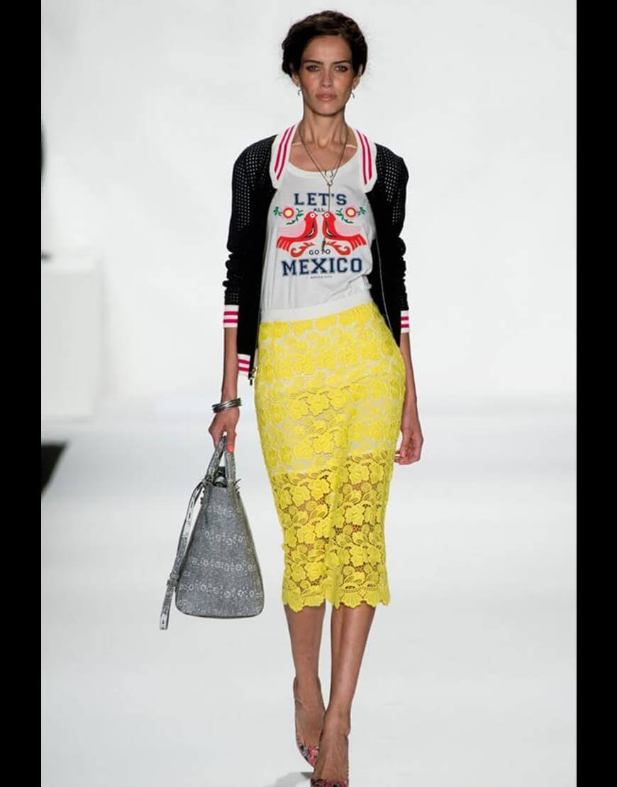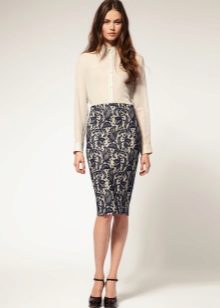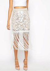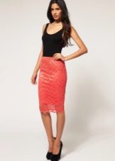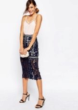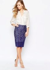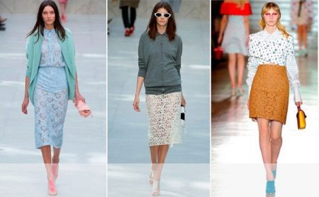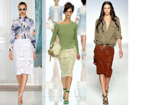 A spectacular lace pencil skirt is perfect for an official meeting, for an informal party, or for a formal reception. The original evening version is a lace pencil skirt with a lining mid-thigh or slightly lower, the rest is transparent. You can add a light, thin silk blouse and evening look is completed. If instead of a blouse, you use a solid top with a denim shirt draped over it, then you can get a great option for every day.