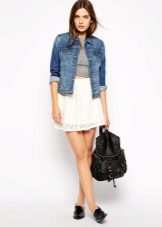 An unexpected look is a combination of a white lace and a blue denim shirt. This image looks very fresh and youth.