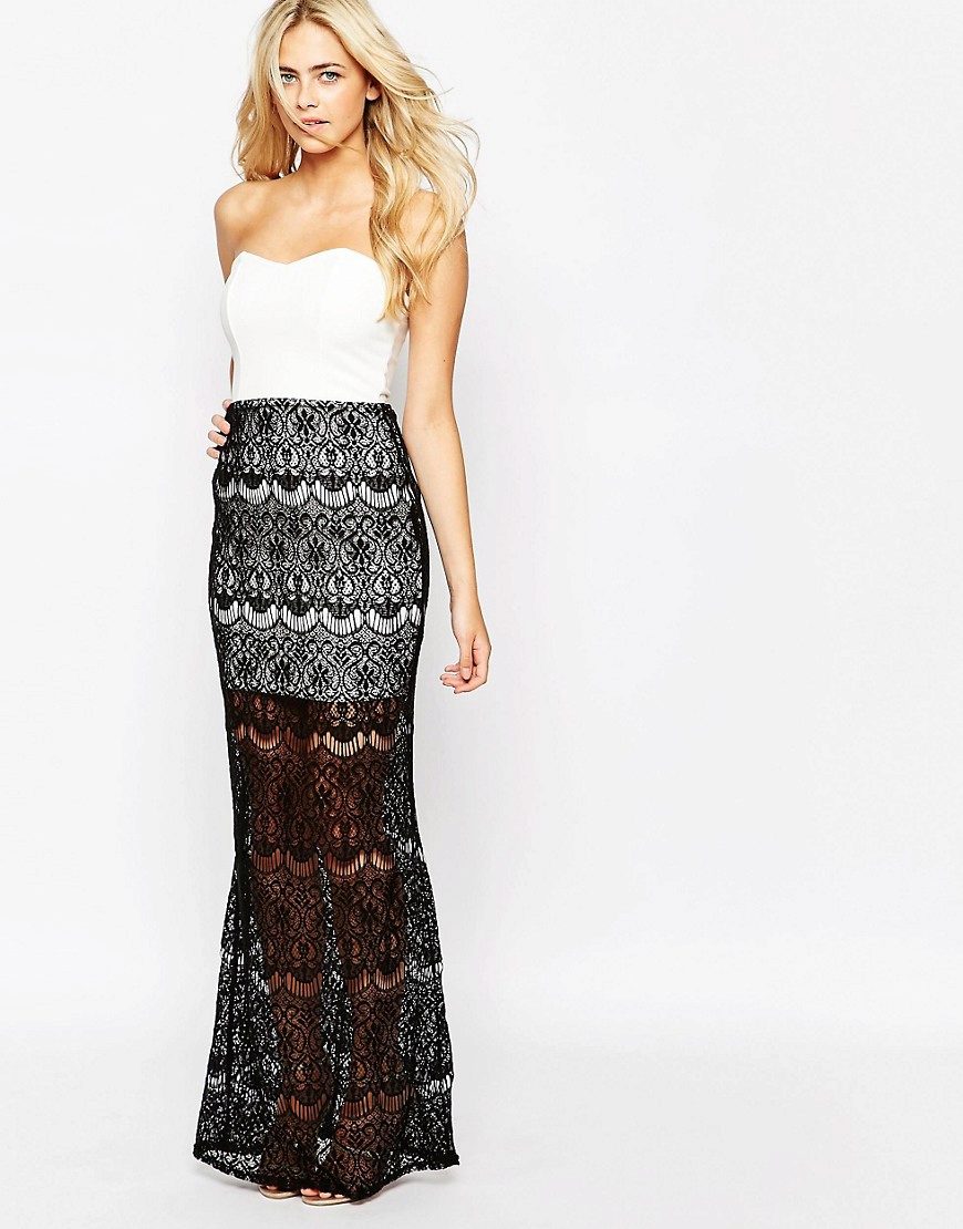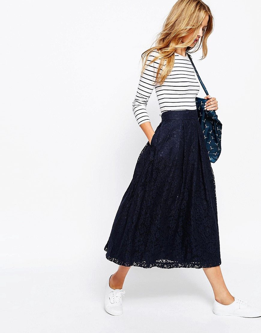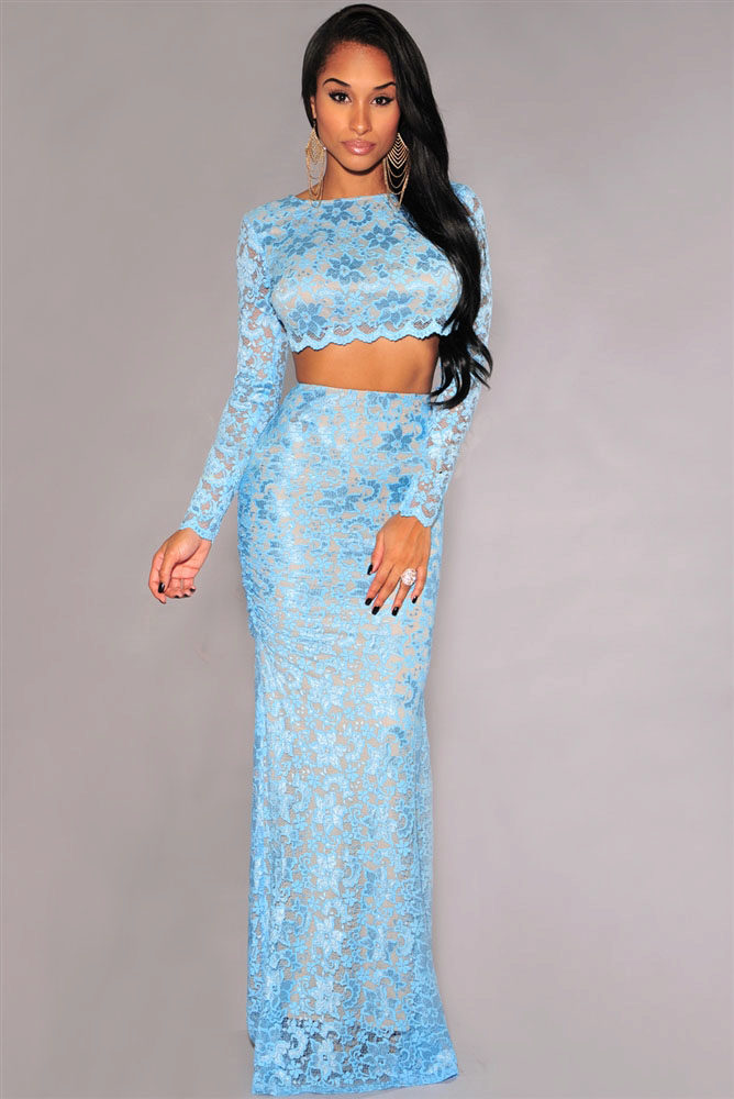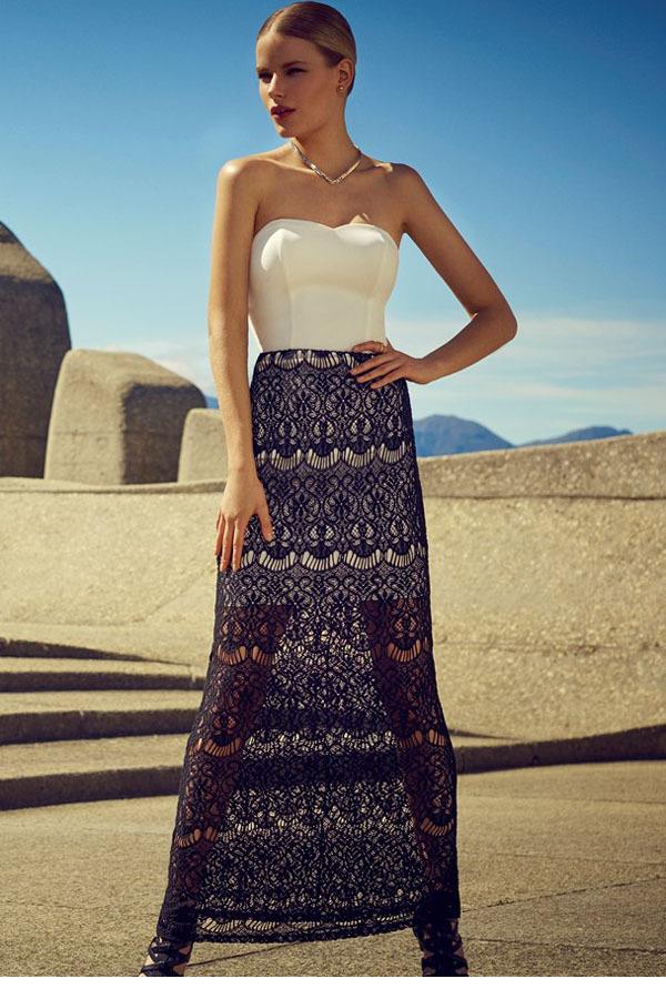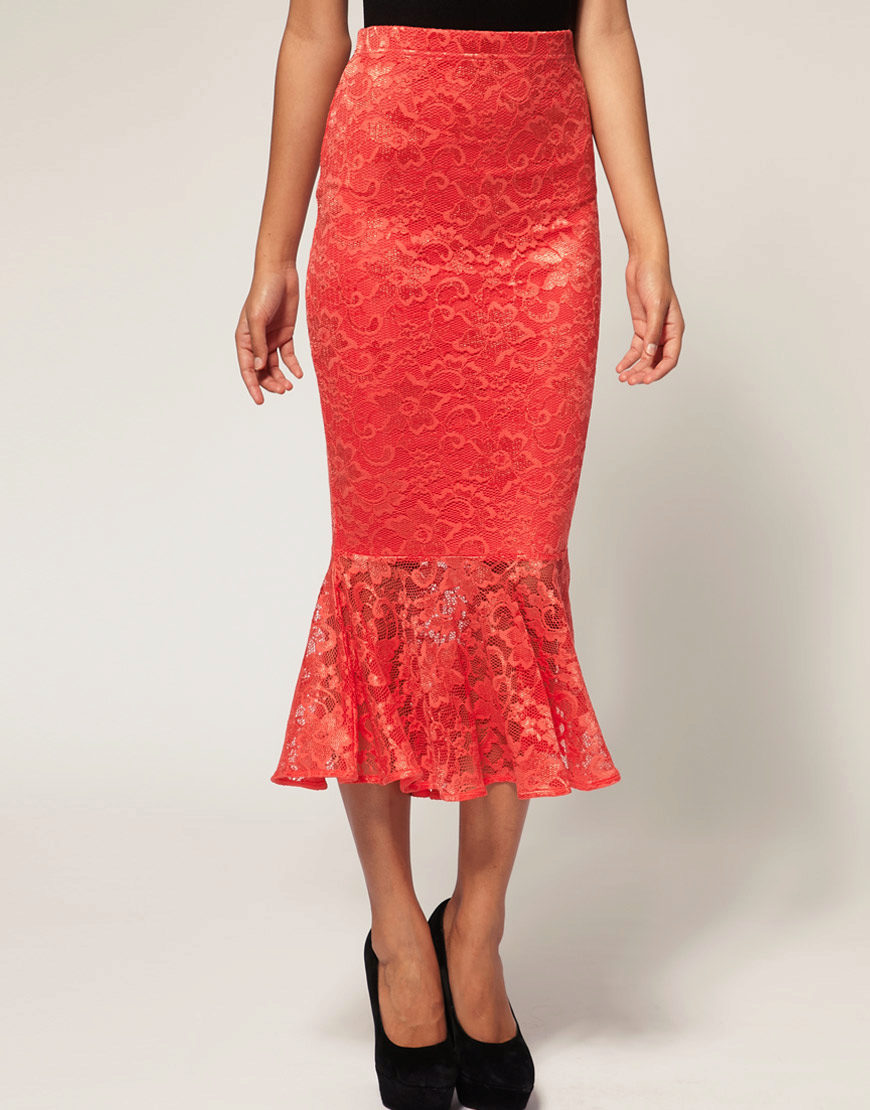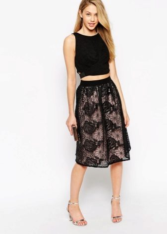 Long lace skirt will always be at the peak of fashion. This style creates an extremely feminine, elegant look. The fitting model will suit the owners of an hourglass-like figure. The tulip-style skirt is good for ladies with wide hips.