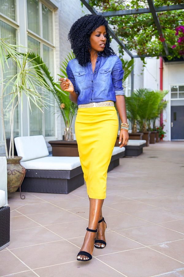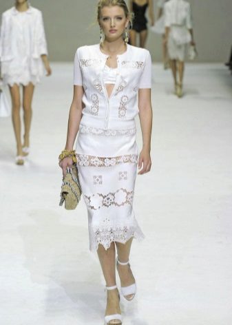 Linen skirts look good with linen blouses made from the same fabric. At the same time, a variety of images is provided by a different neckline and a different length of sleeves in a blouse, and in order to make this monophonic set look more expressive, it is complemented with bright accessories.