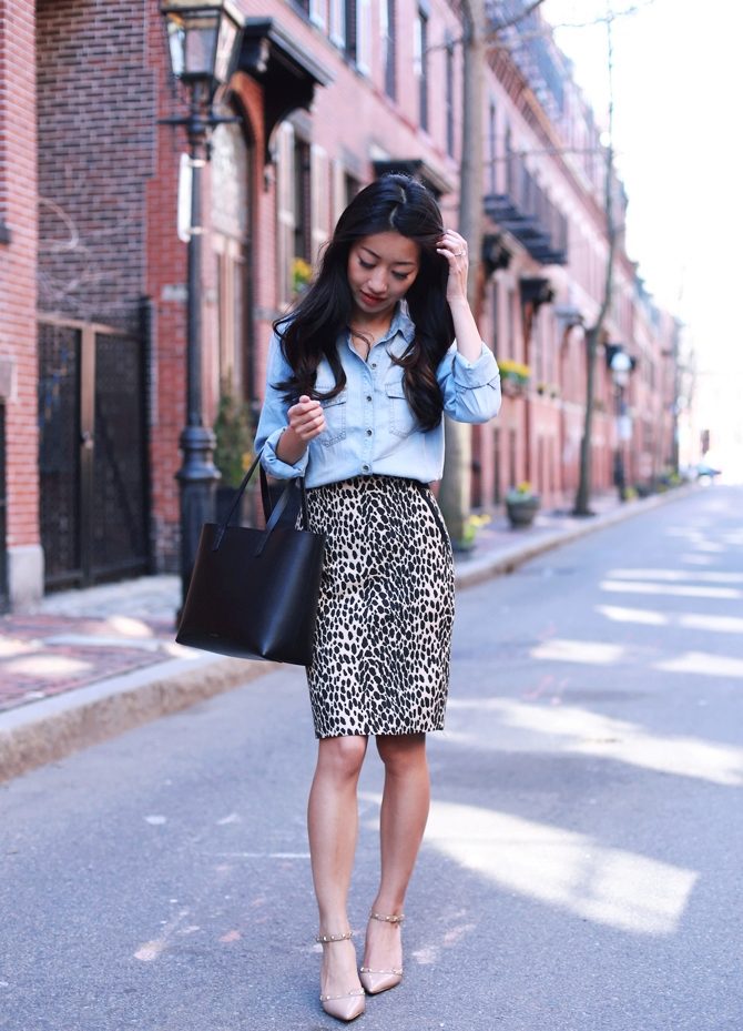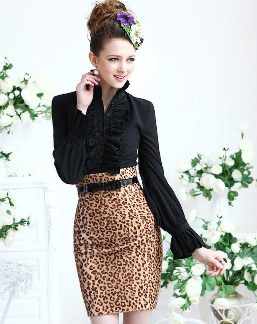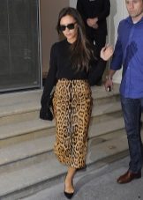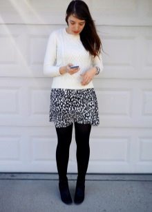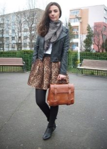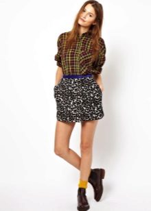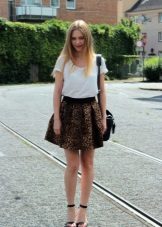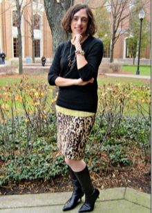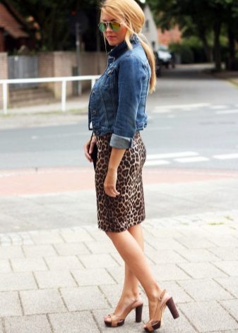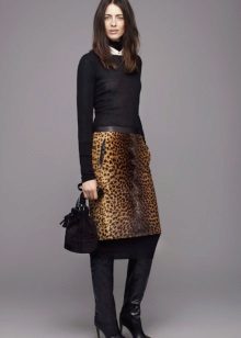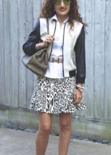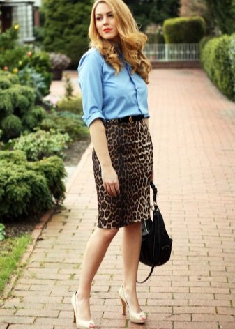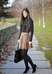 A short skirt in itself attracts attention. Leopard print multiplies this effect. To make the image less aggressive, under this skirt you should wear a closed turtleneck of light, pastel colors. The image will help to add a fitted jacket. Avoid bright, catchy accessories. The image should look quite strictly and concisely.
