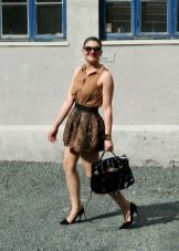 For a festive event or a corporate party for such a skirt, you can choose an elegant black top, elegant high-heeled shoes, a neat clutch bag or a black handbag. The leopard skirt looks very interesting with an asymmetrical black top opening one shoulder.