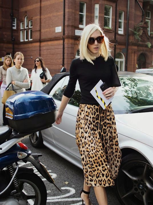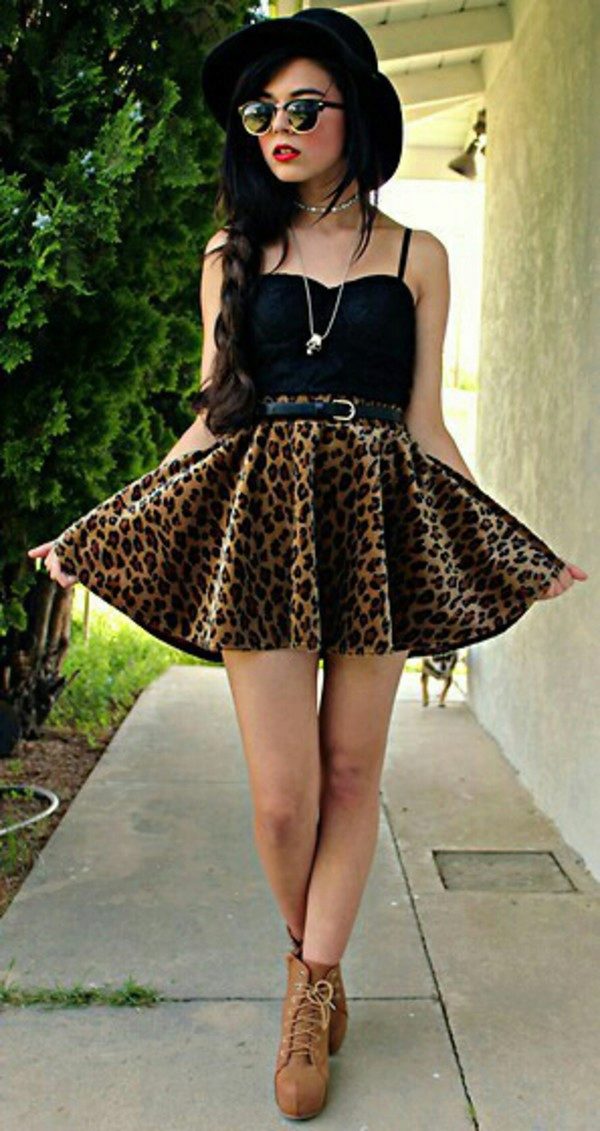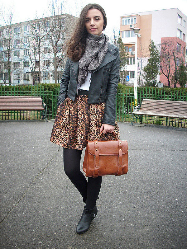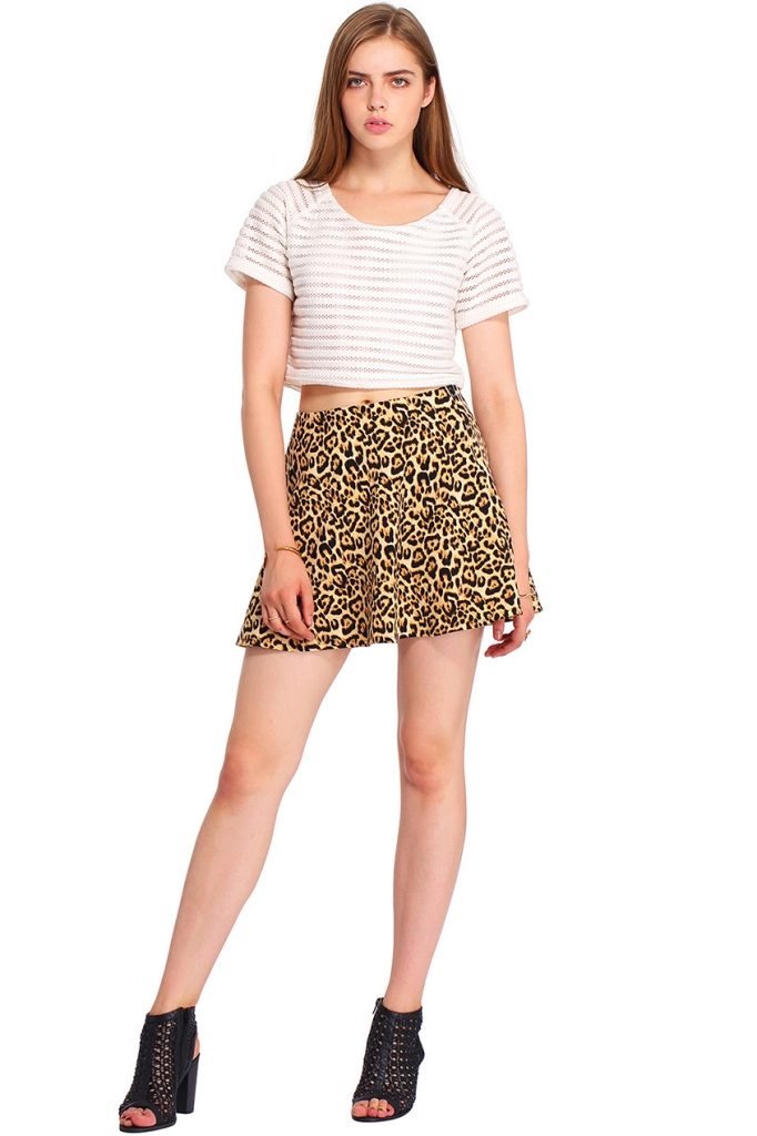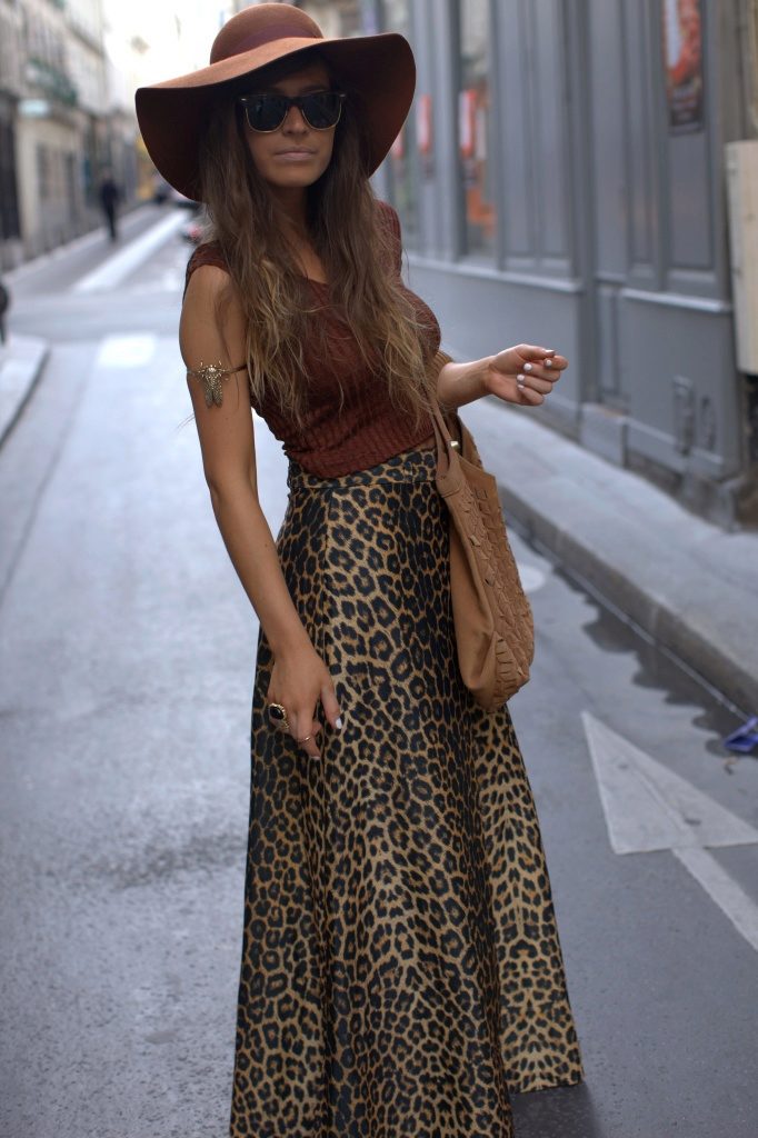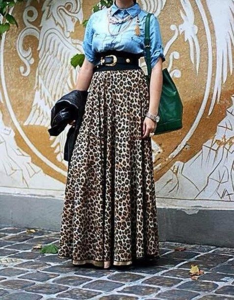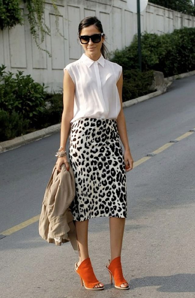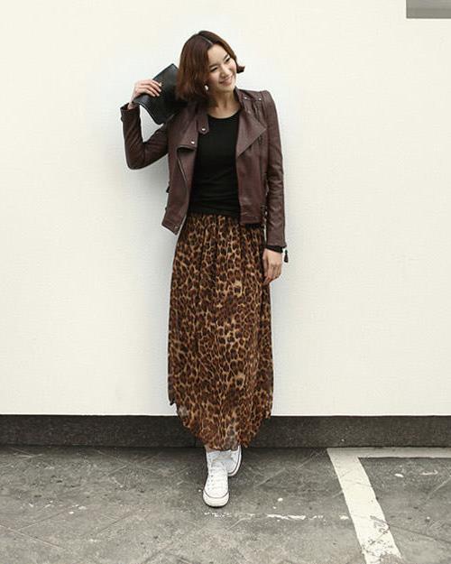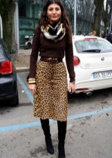 Leopard skirt goes well with clothes of white, black, gray and all shades of brown. Be especially careful with red or blue clothes.