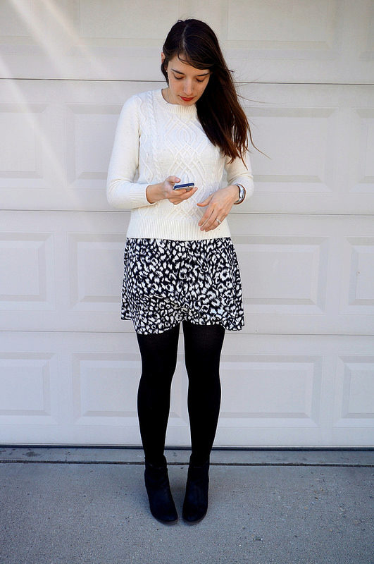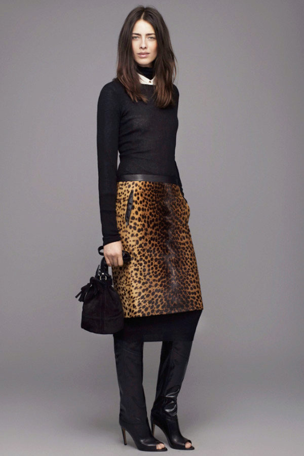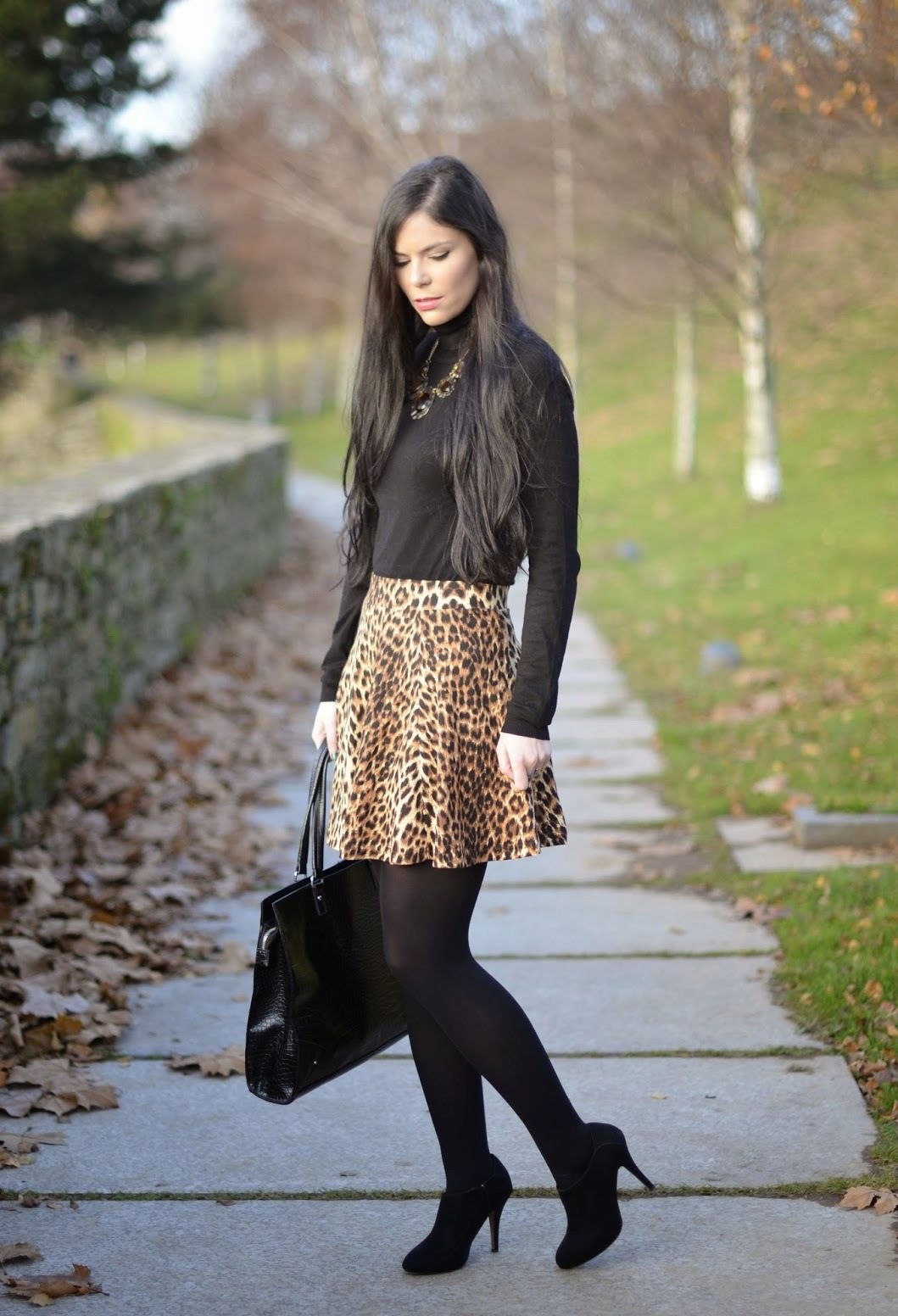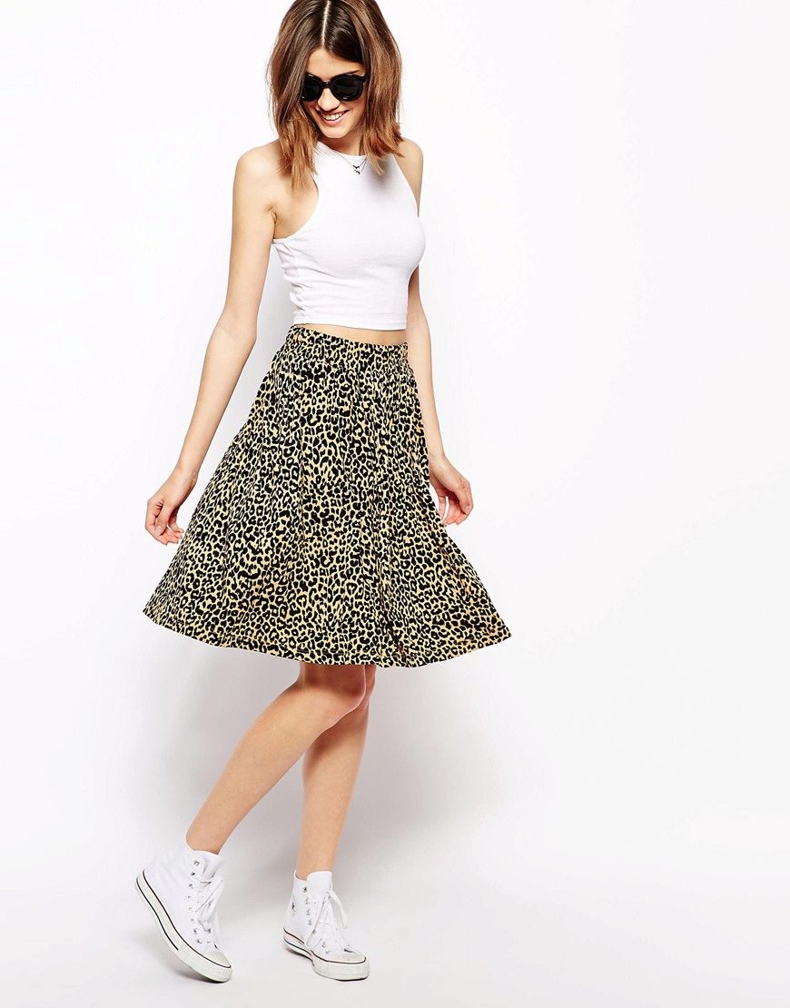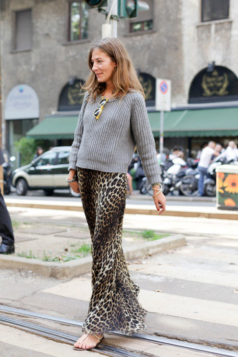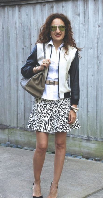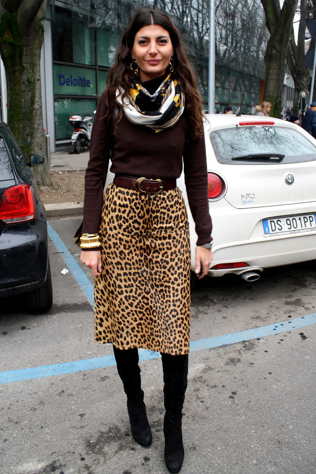 Leopard skirt goes well with clothes of white, black, gray and all shades of brown. Be especially careful with red or blue clothes.