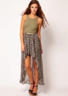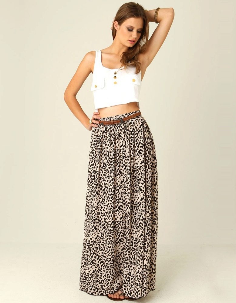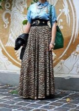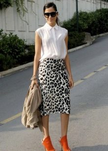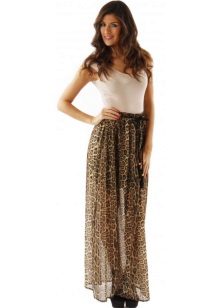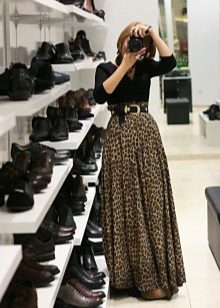 A long leopard skirt looks good with a snow-white shirt or top. A thin strap or belt accentuates the waist, and light sandals or sandals complete the look.