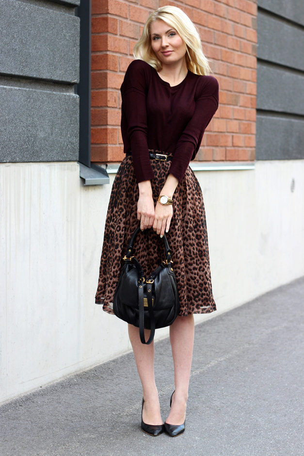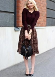 A very interesting look can come out if you wear a black short-sleeved blouse, dark cherry shoes with high heels and a belt of the same color in a leopard skirt.
