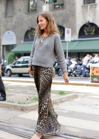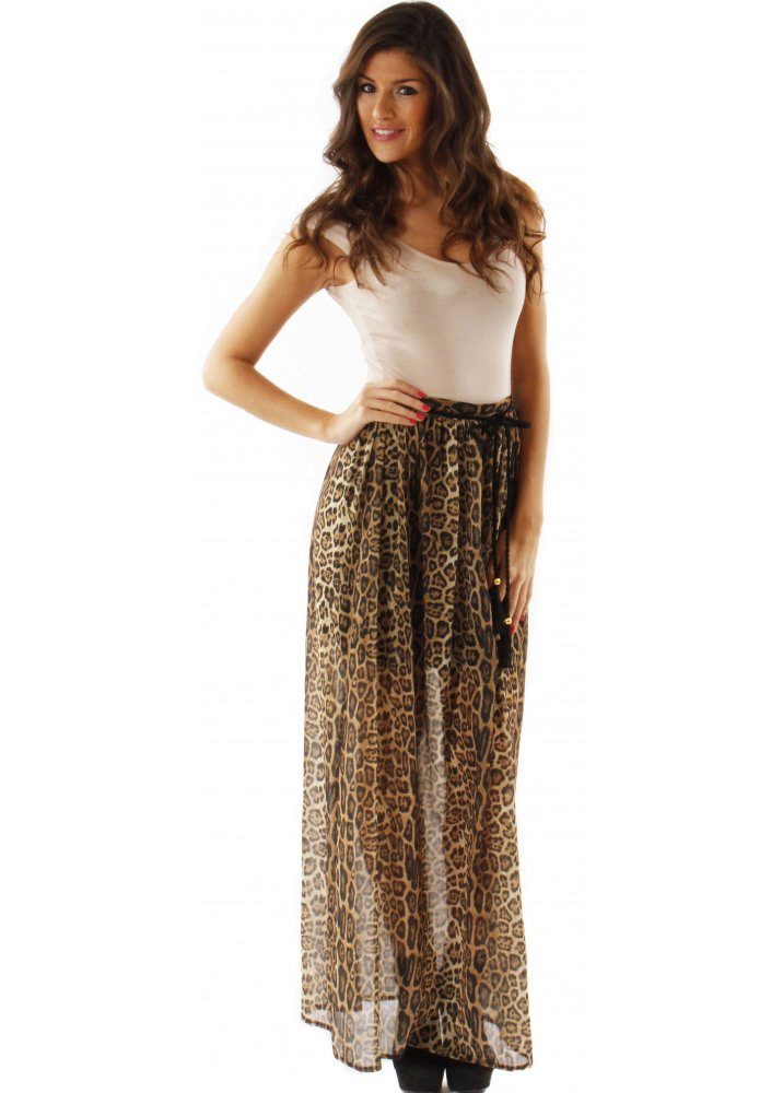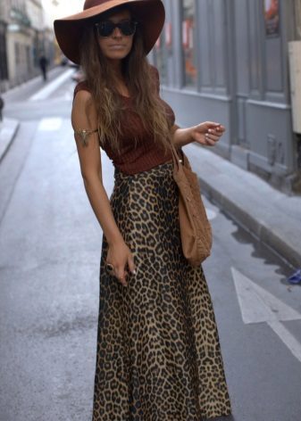 A leopard-patterned long skirt is a great idea for an evening look. A harmonious pair with such a skirt will be a simple smooth or opposite - a bright top decorated with sequins. Handbag and shoes made in golden tones will complete the look.