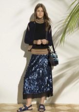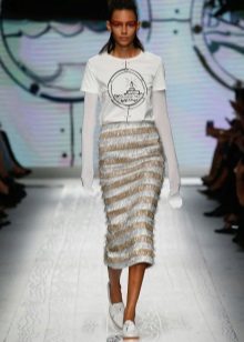 Midi skirts, made of thin, lightweight fabrics, go well with T-shirts, T-shirts or tops. Jacket, jacket or vest will help to complete the created image. As shoes you can pick up classic pumps, ballet shoes or sports shoes.