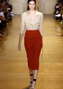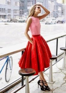 Red midi skirt is a very expressive piece of clothing. This color in itself attracts attention, so before choosing the appropriate top, you need to decide on what effect you expect from the resulting image.