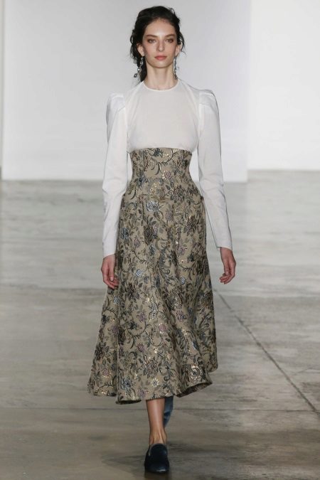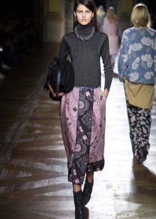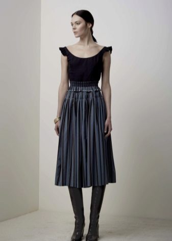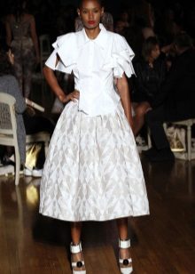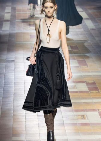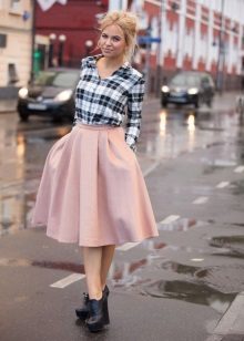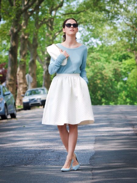 Fluffy, wide skirts of medium length are ideal for creating a romantic, feminine image. They are perfectly combined with classic blouses, beautiful tops, slinky turtlenecks. To create a more informal look, you can wear a denim shirt or a sweater, for example.