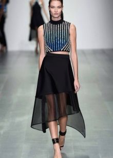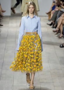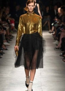 A tulle midi skirt helps create a romantic, tender look. Ideal for young girls. It combines with blouses decorated with all kinds of ruffles, ruffles and folds. High-heeled shoes will complement the flirty image.