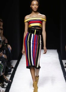The strip is always relevant.It is best to choose a model with a vertical or zigzag stripe - this figure visually pulls the figure.