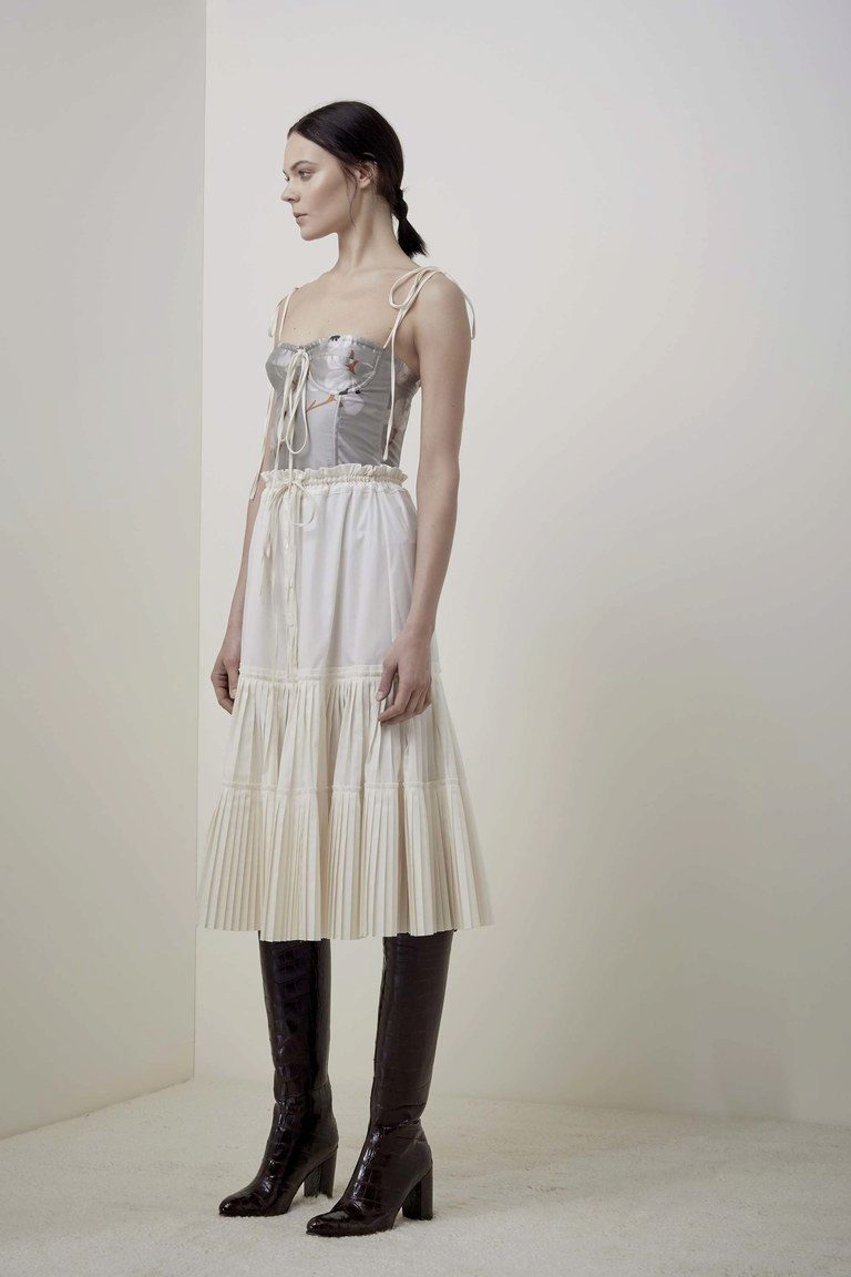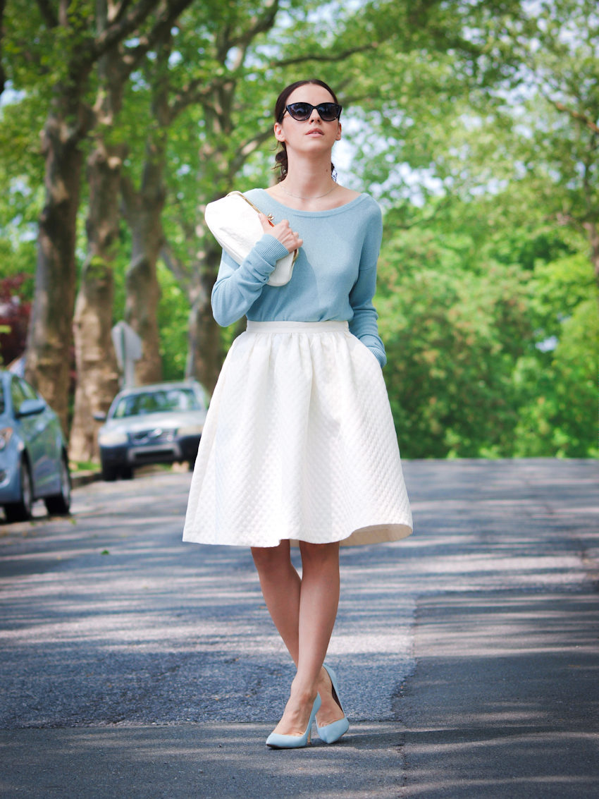 A pastel-colored semi-sun skirt looks great with a white top bustier. A draped jacket will help create a more modest and gentle look.