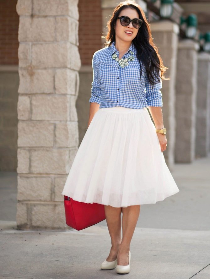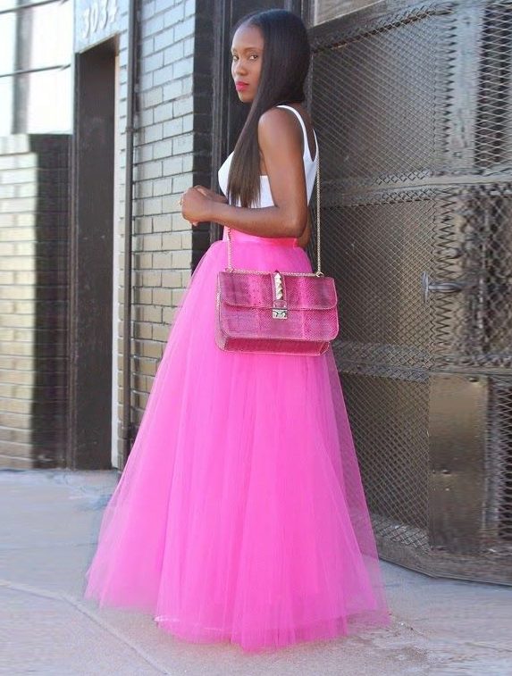 A multi-layered skirt with a high waist perfectly hides all the flaws of the “inverted triangle” figure and will favorably highlight the proportions of the silhouette, making the thin waist visually even slimmer. And the fluffy skirt will add the necessary volume to the narrow hips.