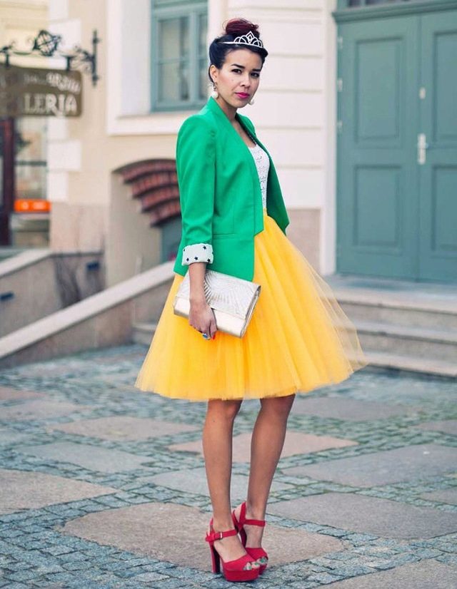 Owners of full hips should avoid wide layers and monotony. It is better to choose bright shades with different tier widths. This will hide the figure flaws, and will focus on the contrast of colors.