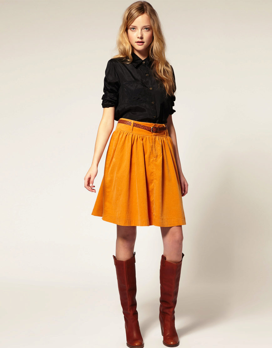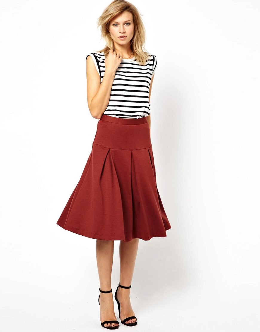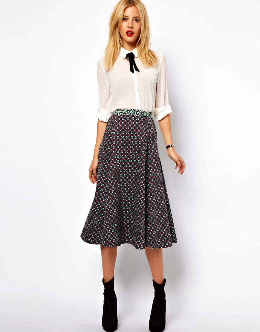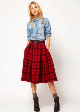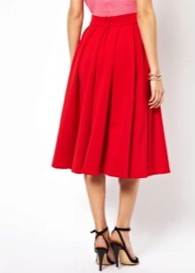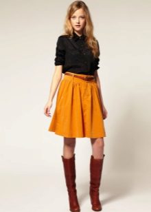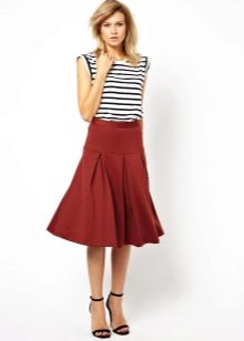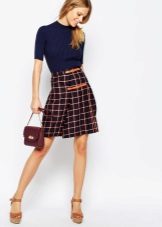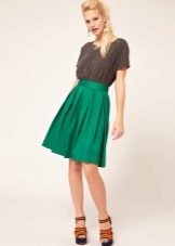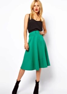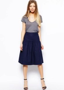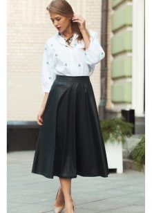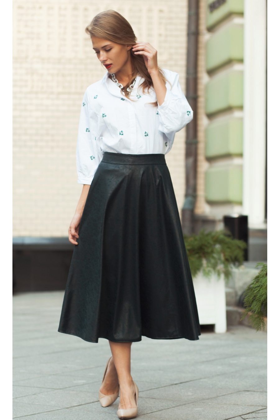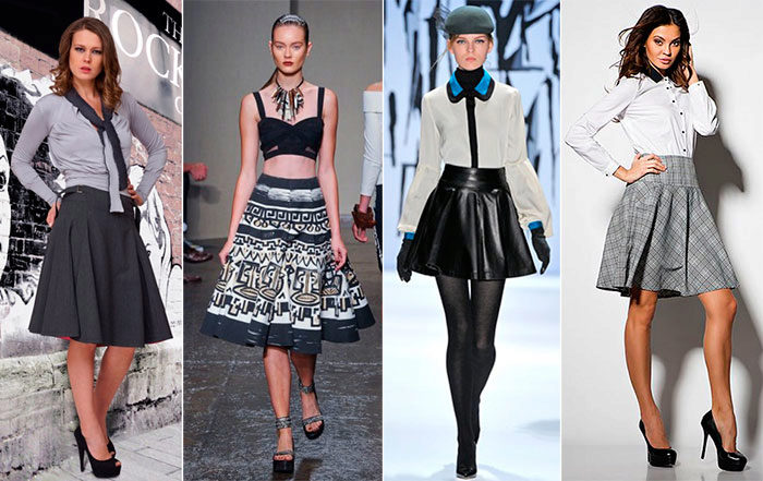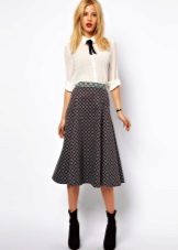 A-line skirt with a yoke goes well with different top options: classic blouse, strict shirt, smooth top, bright t-shirt, tight-fitting shirt, etc.