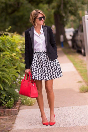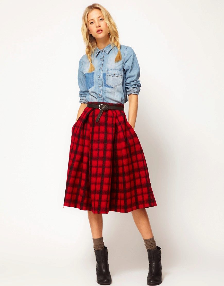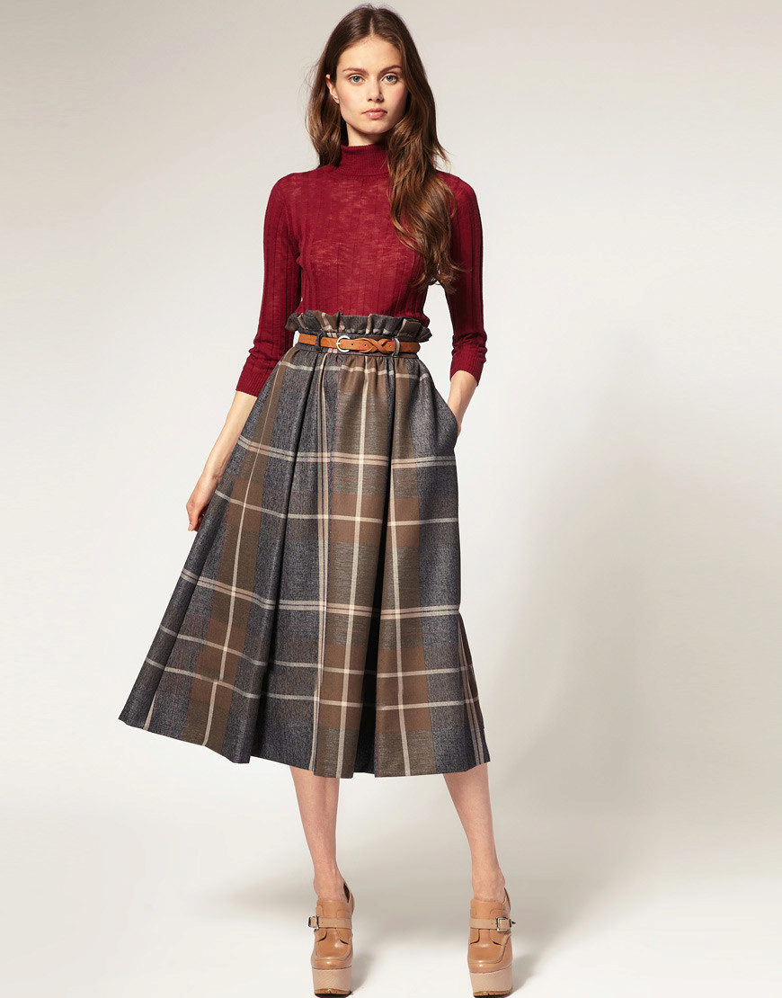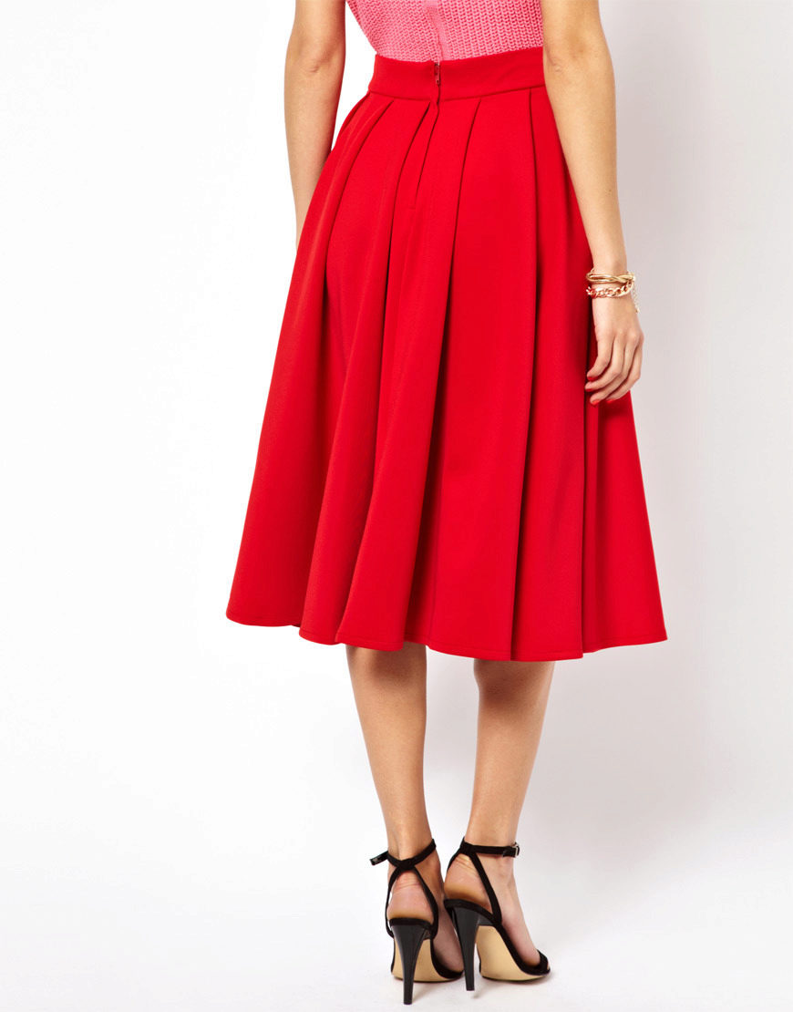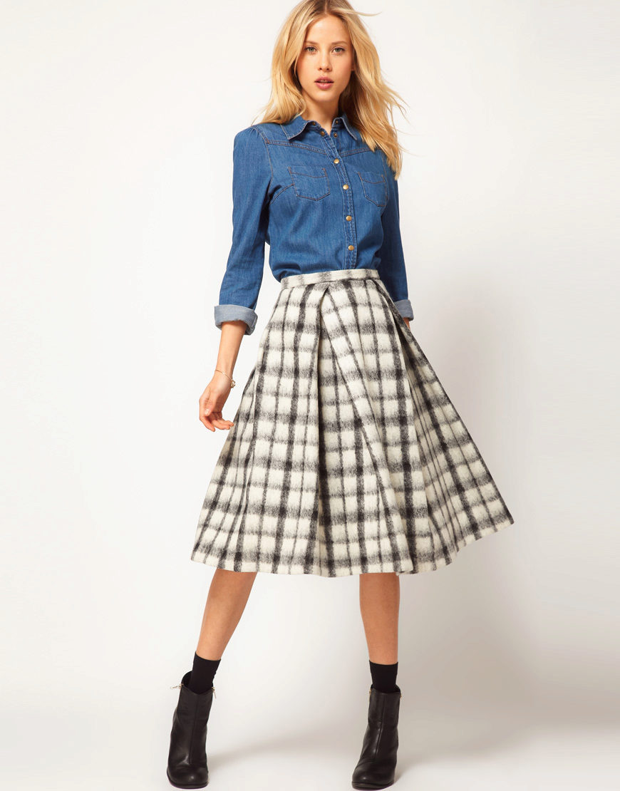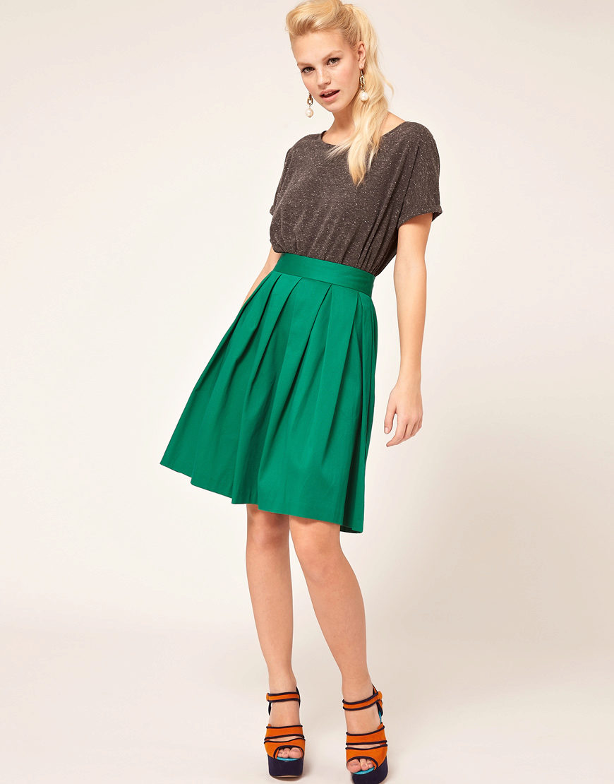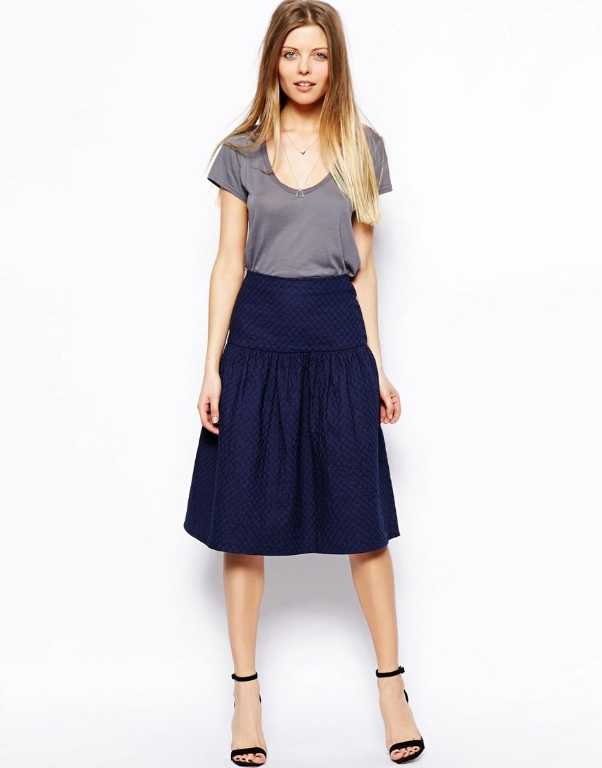A-line skirt with a yoke goes well with different top options: classic blouse, strict shirt, smooth top, bright t-shirt, tight-fitting shirt, etc.