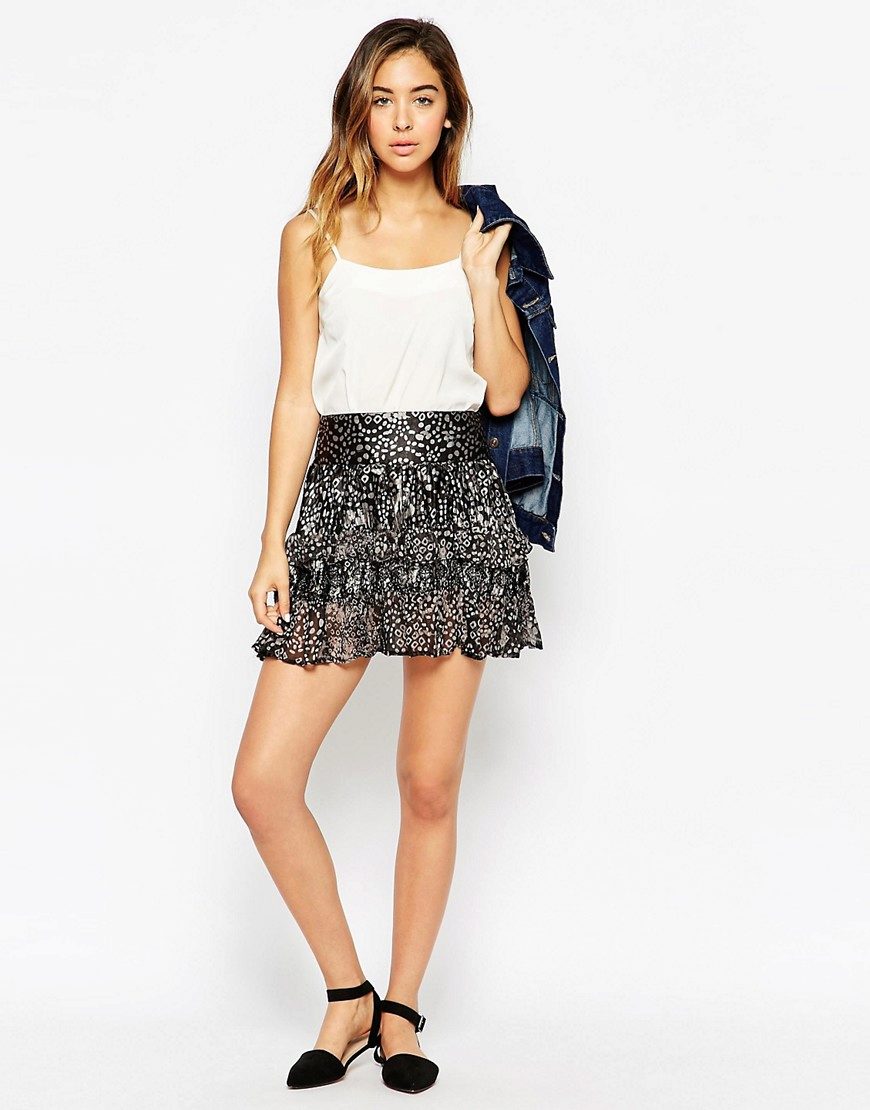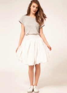 The skirt on the coquette looks equally nice with different versions of shoes. These can be classic stilettos, bright ballet flats, snow-white sneakers, platform sandals, flat sandals, ankle boots, boots, etc.