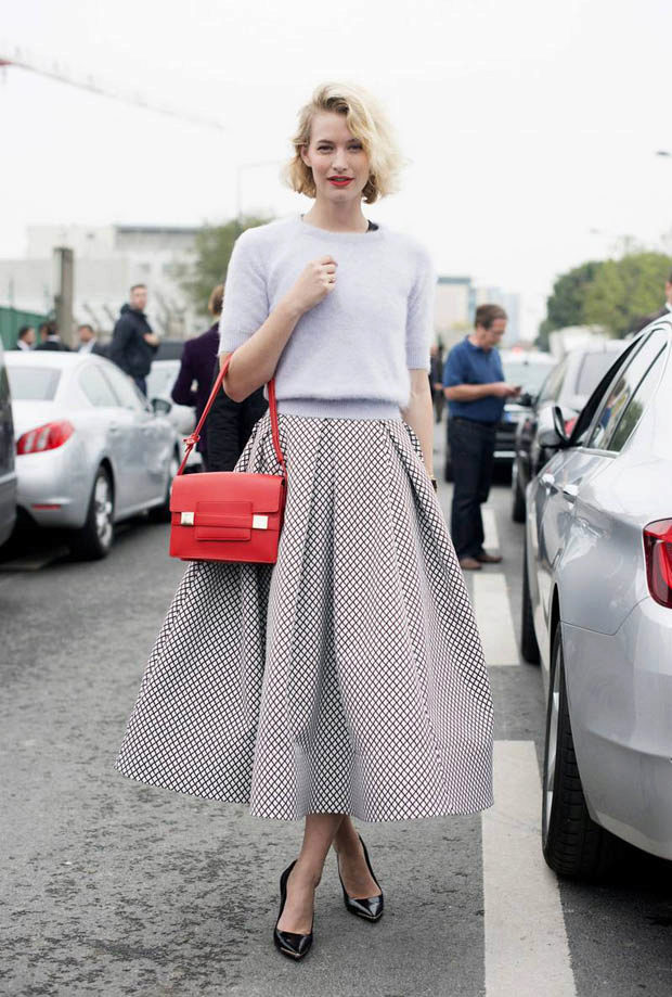 In the office, a bell skirt is appropriate to wear with tight-fitting blouses and shirts of plain pastel colors tucked inside.