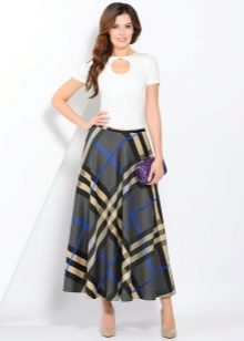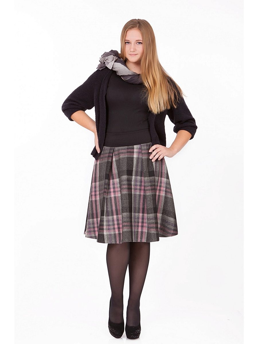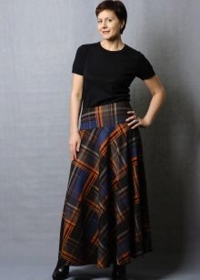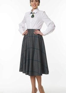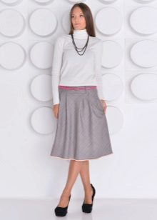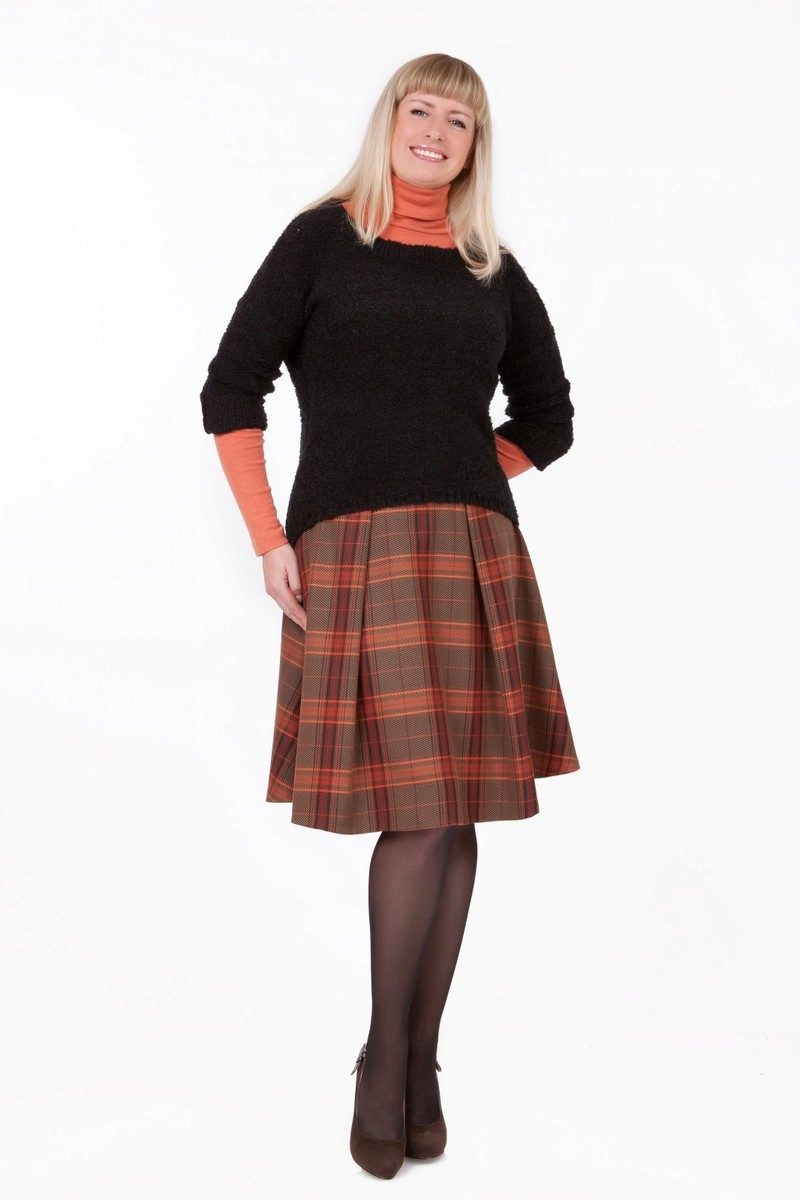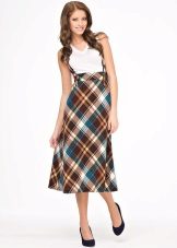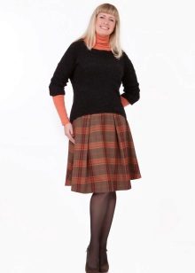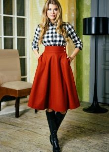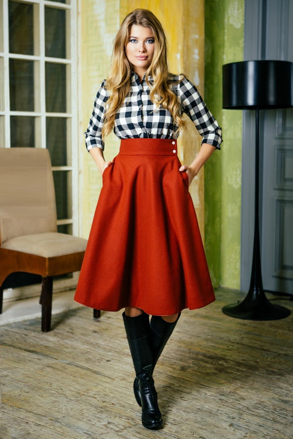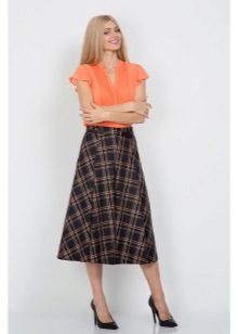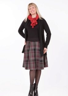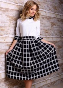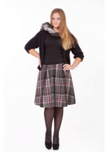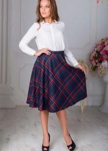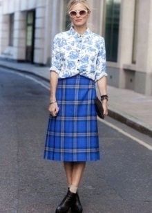 Often girls prefer a skirt in a cage. This coloring will be perfectly combined with blouses made of translucent fabrics, knitted blouses. This tandem is suitable for slender girls who have the perfect figure. A small handbag and retro-inspired glasses will help add style to the image. Fat women should combine a plaid skirt with classic fitted shirts. Low-heeled or wedge shoes will successfully complete the silhouette.