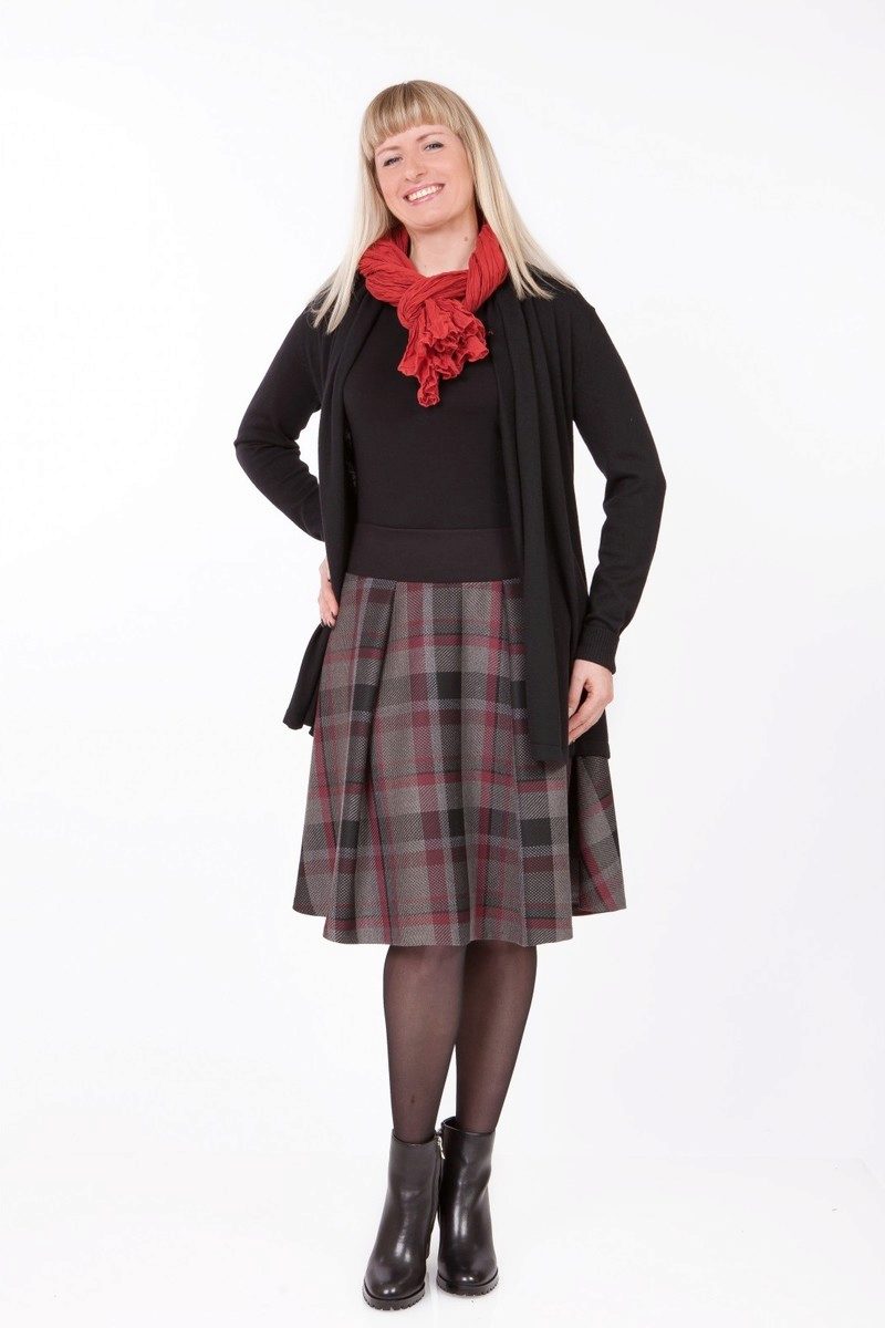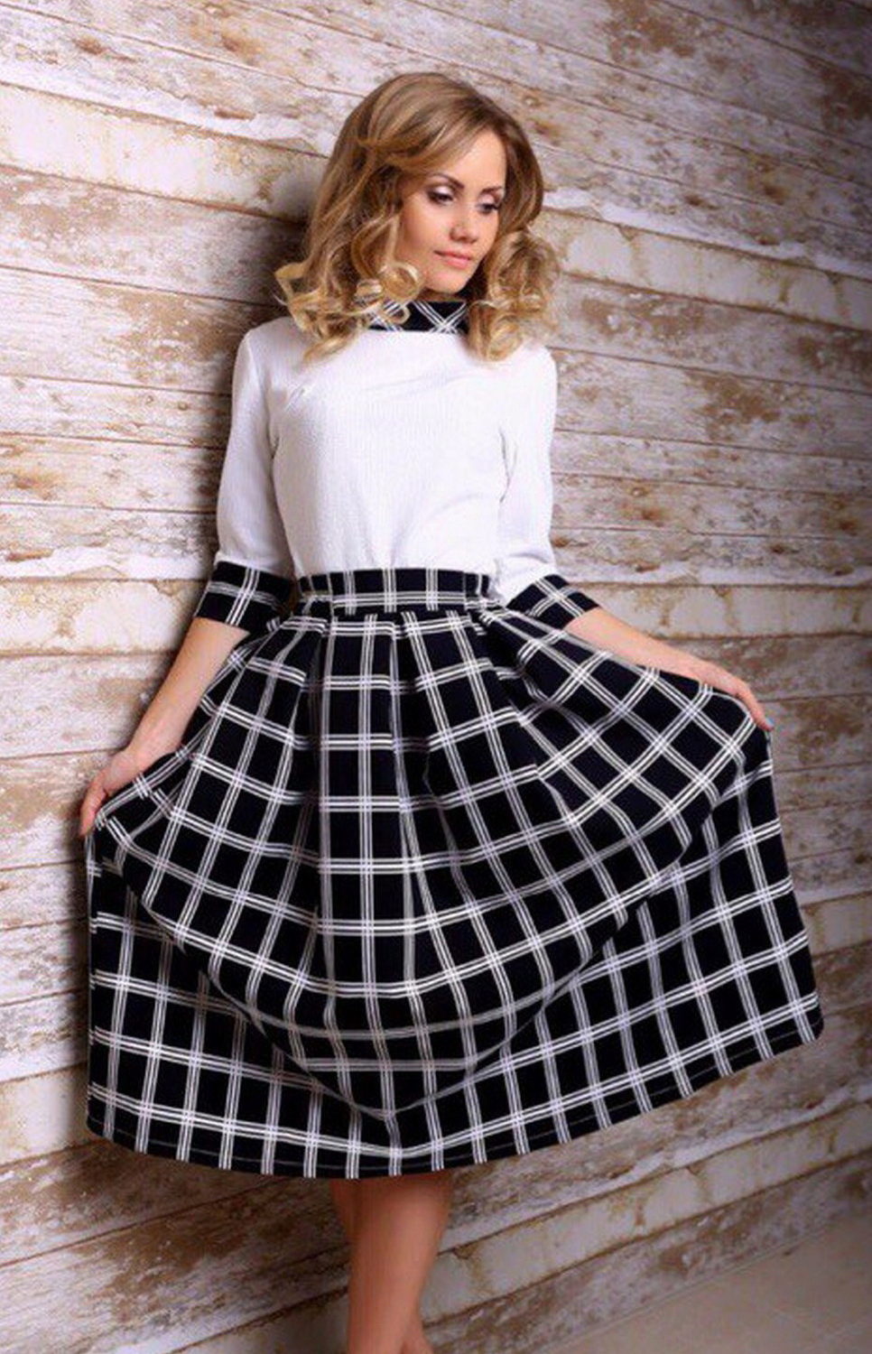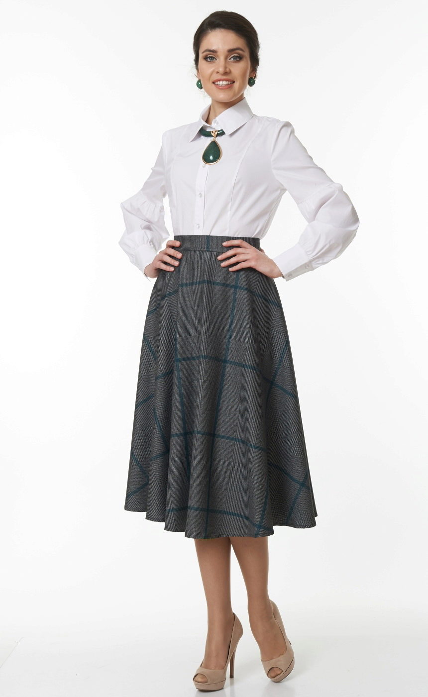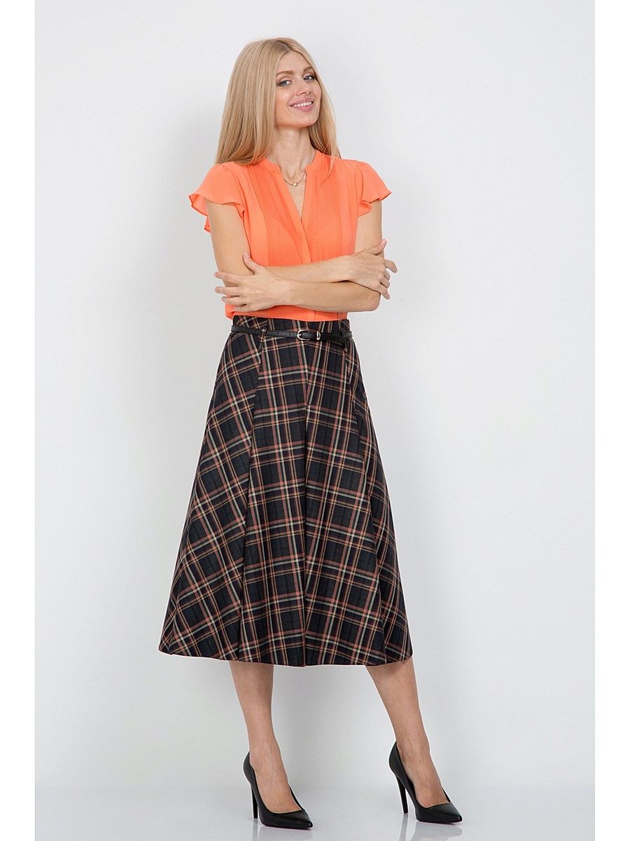 Often girls prefer a skirt in a cage. This coloring will be perfectly combined with blouses made of translucent fabrics, knitted blouses. This tandem is suitable for slender girls who have the perfect figure. A small handbag and retro-inspired glasses will help add style to the image. Fat women should combine a plaid skirt with classic fitted shirts. Low-heeled or wedge shoes will successfully complete the silhouette.
