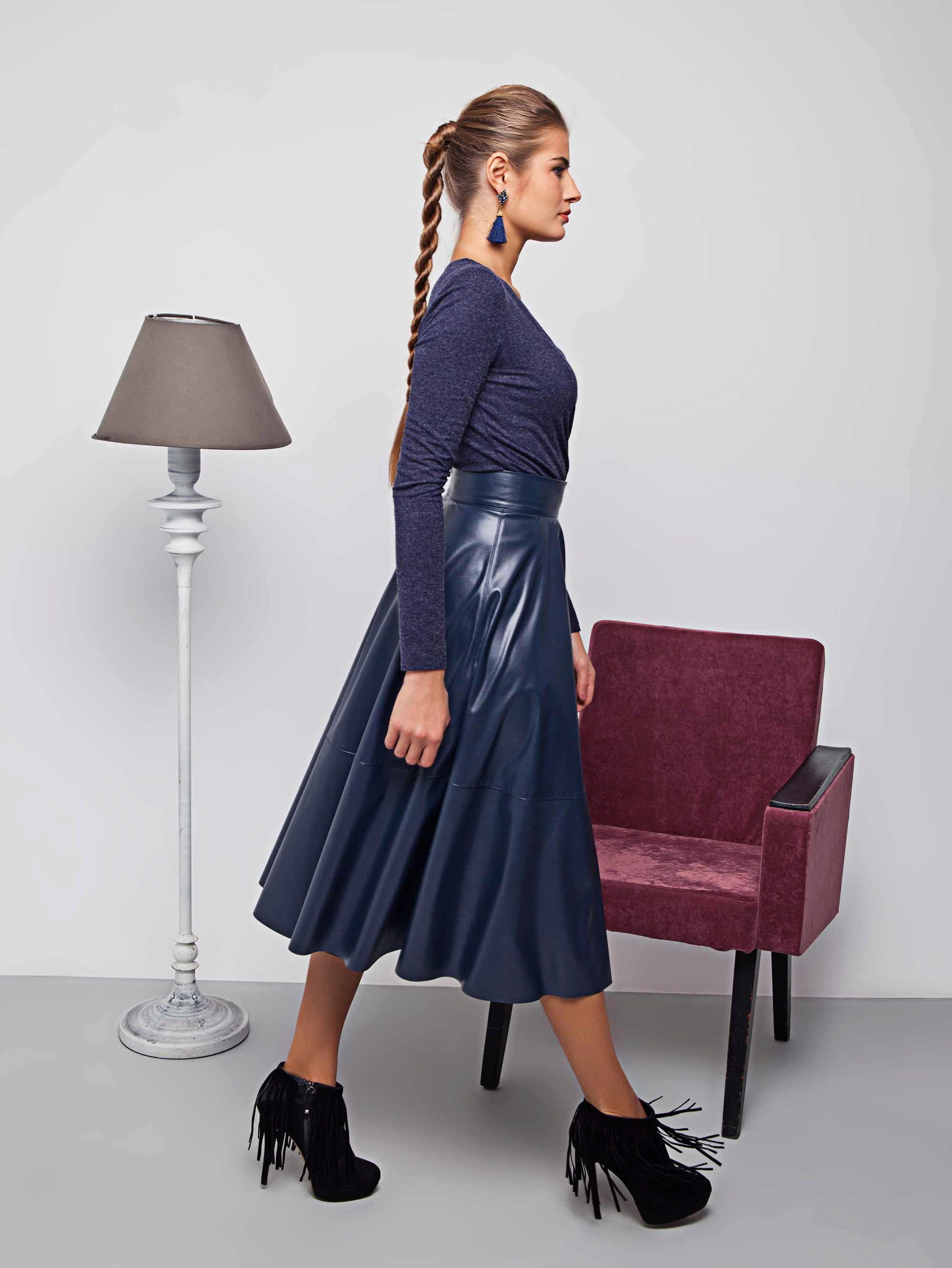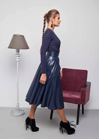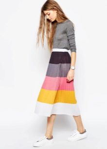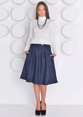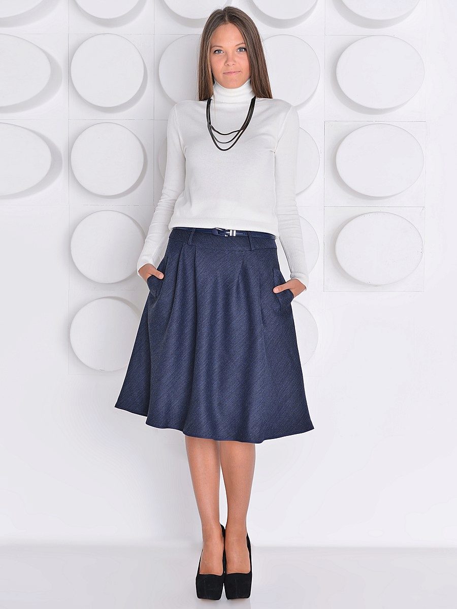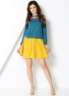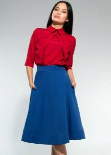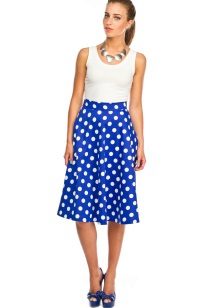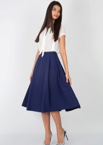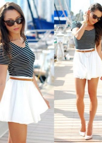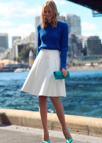 The blue skirt goes well with the top of white, yellow, green or black. An excellent addition to the image can be a horizontal striped t-shirt or sweater.
