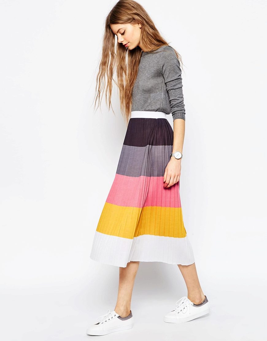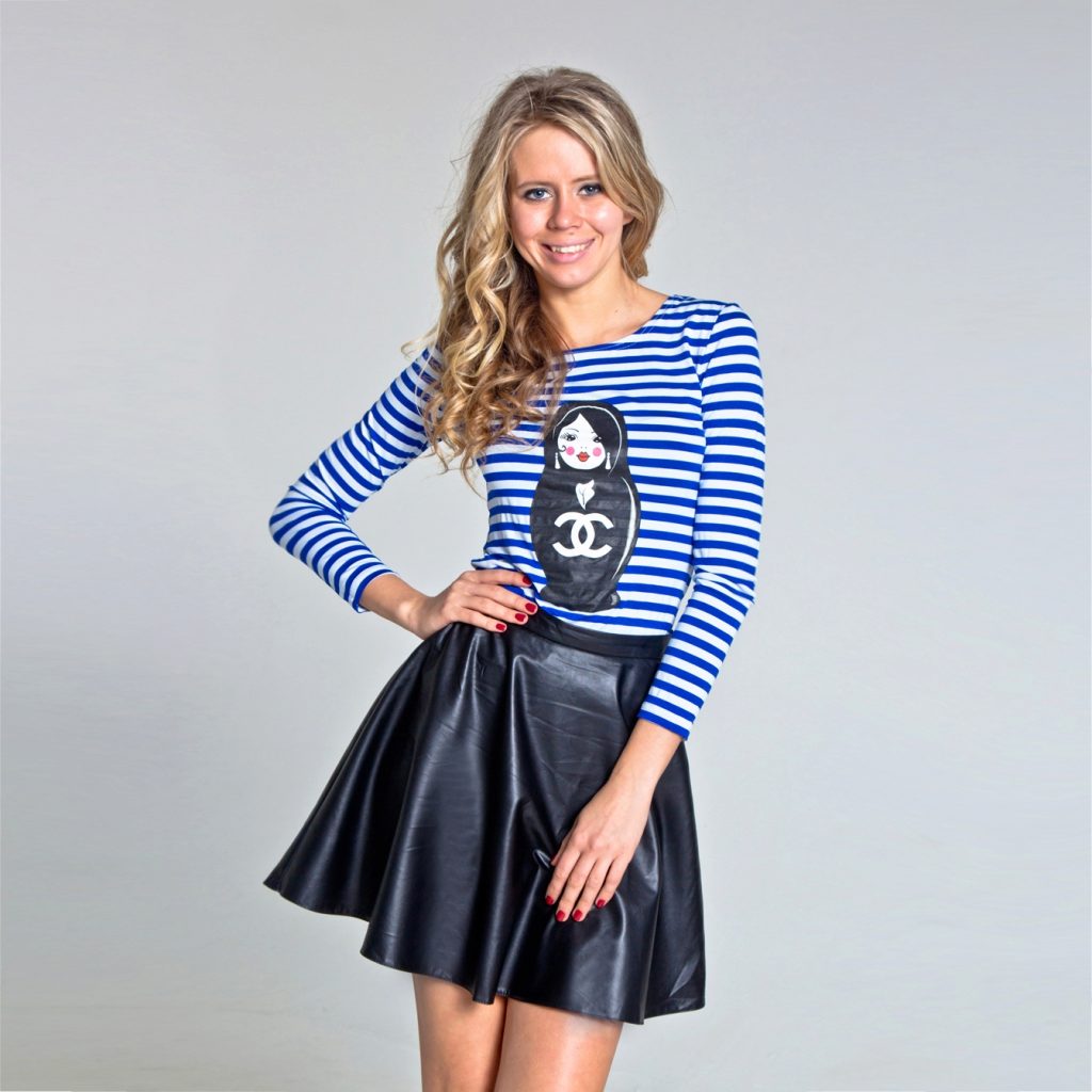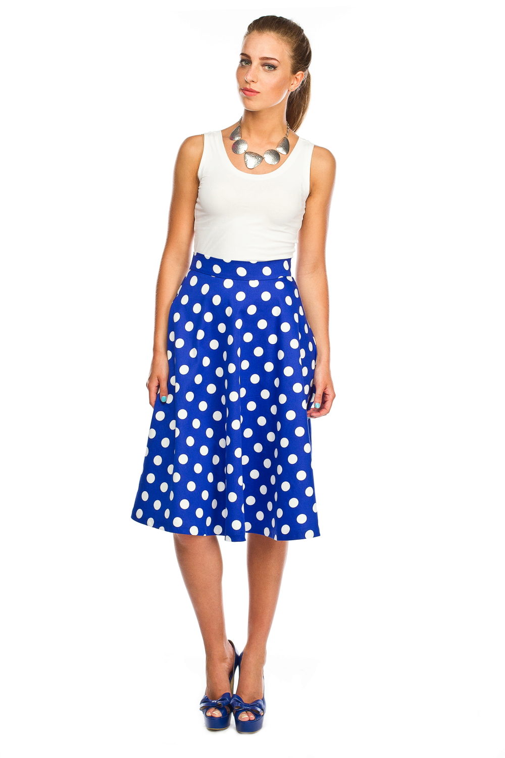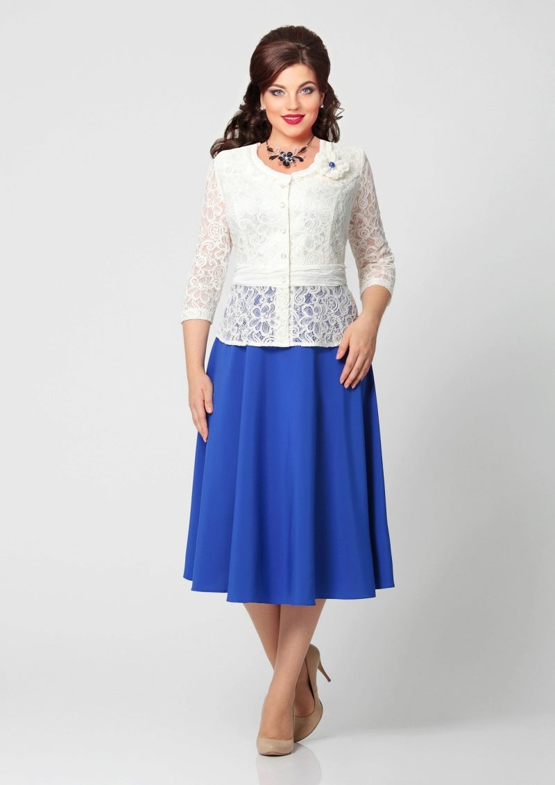 The blue skirt goes well with the top of white, yellow, green or black. An excellent addition to the image can be a horizontal striped t-shirt or sweater.