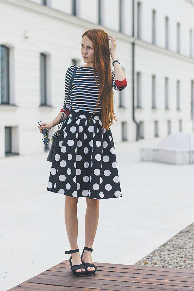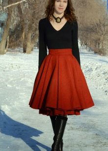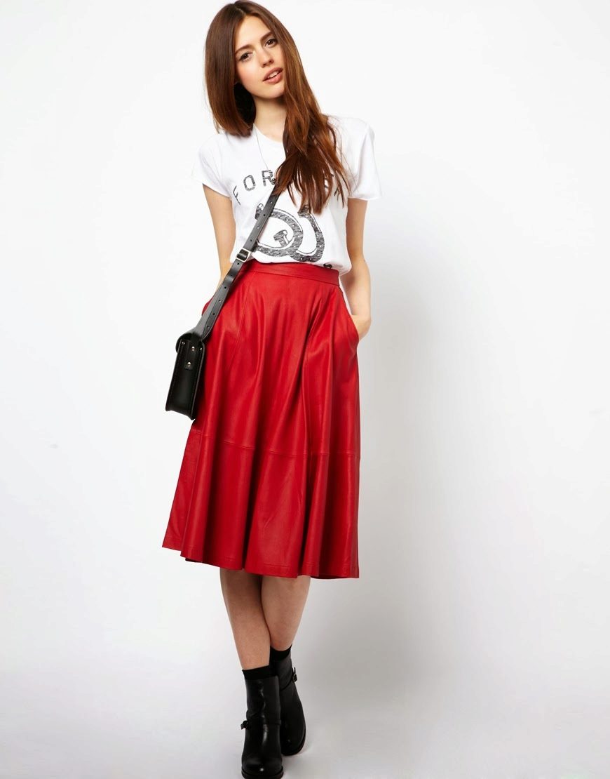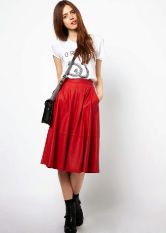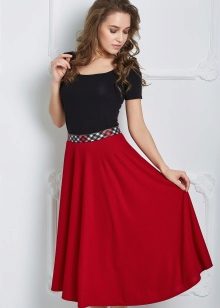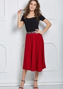 .To visually enlarge breasts, a stylish striped top or model decorated with an original print will suit the skirt in red When choosing a color, you can dwell on black, because many people prefer a combination of black and red.