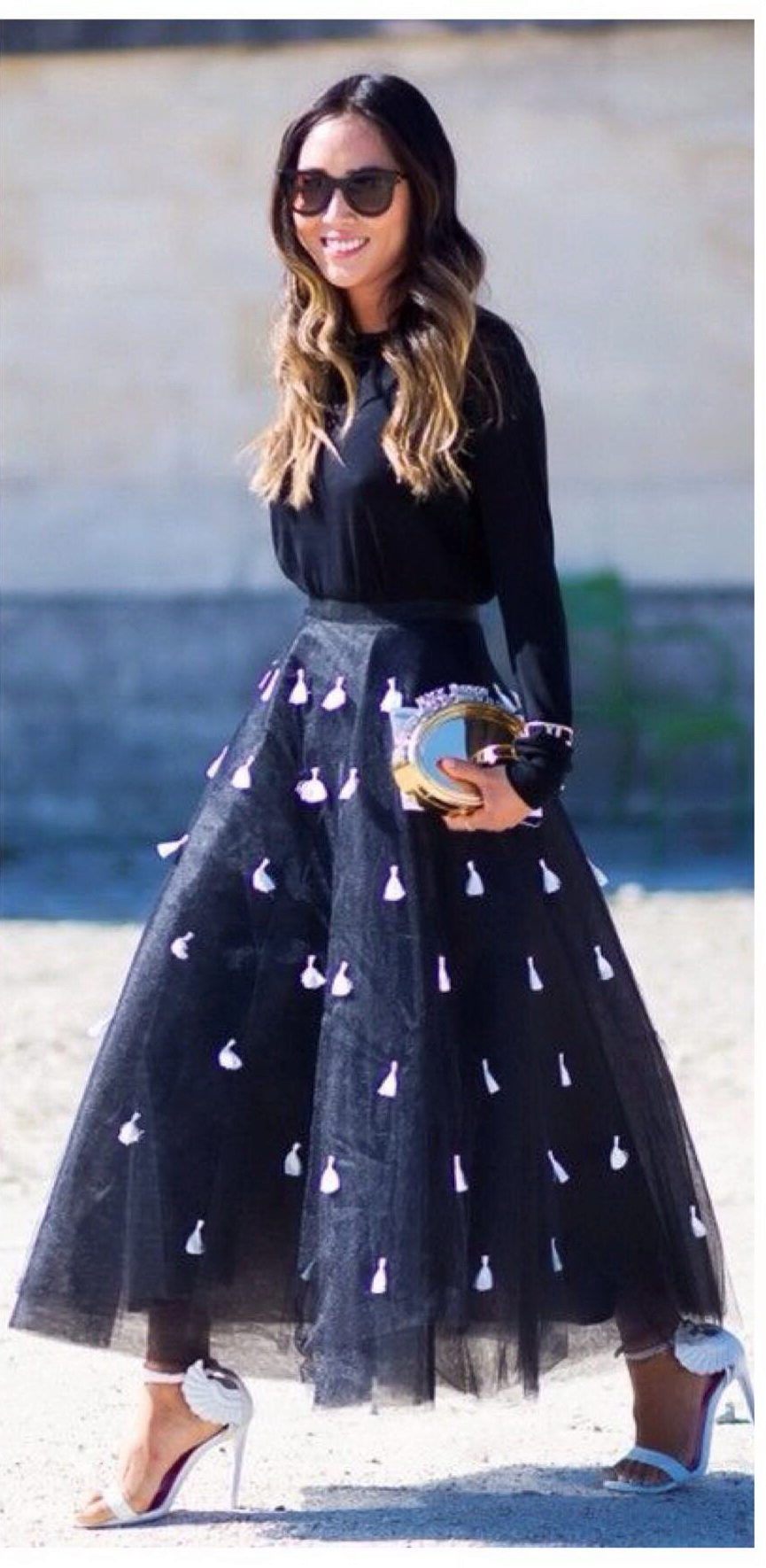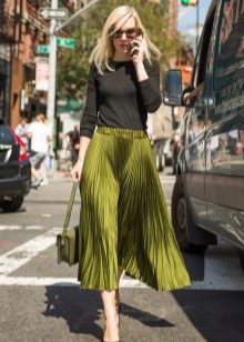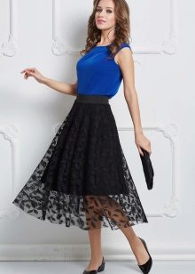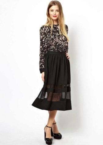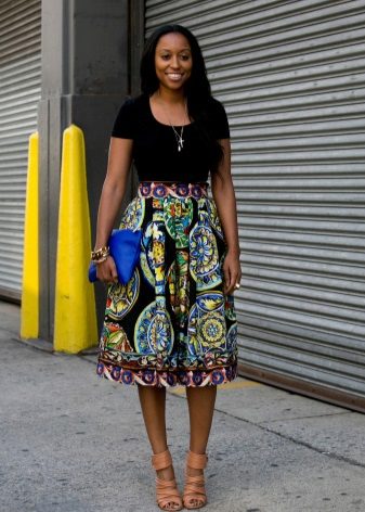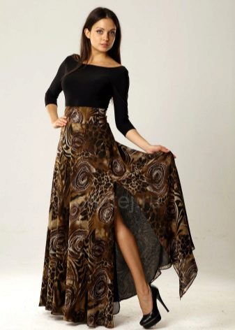 For example, a perfect solution would be a chiffon skirt, which will bring extravagance to the image. Satin lining fascinates and attracts attention. A short top and black sandals are perfect for this skirt.